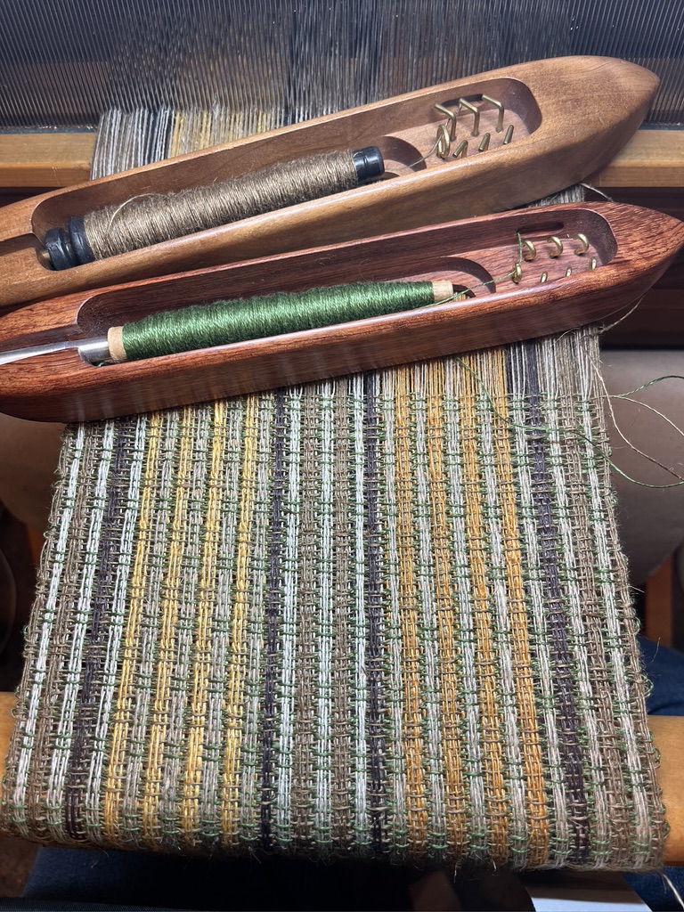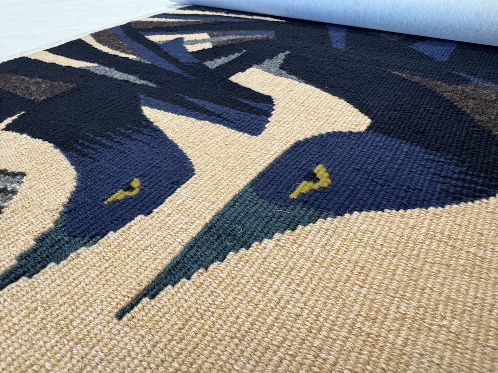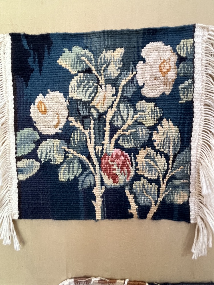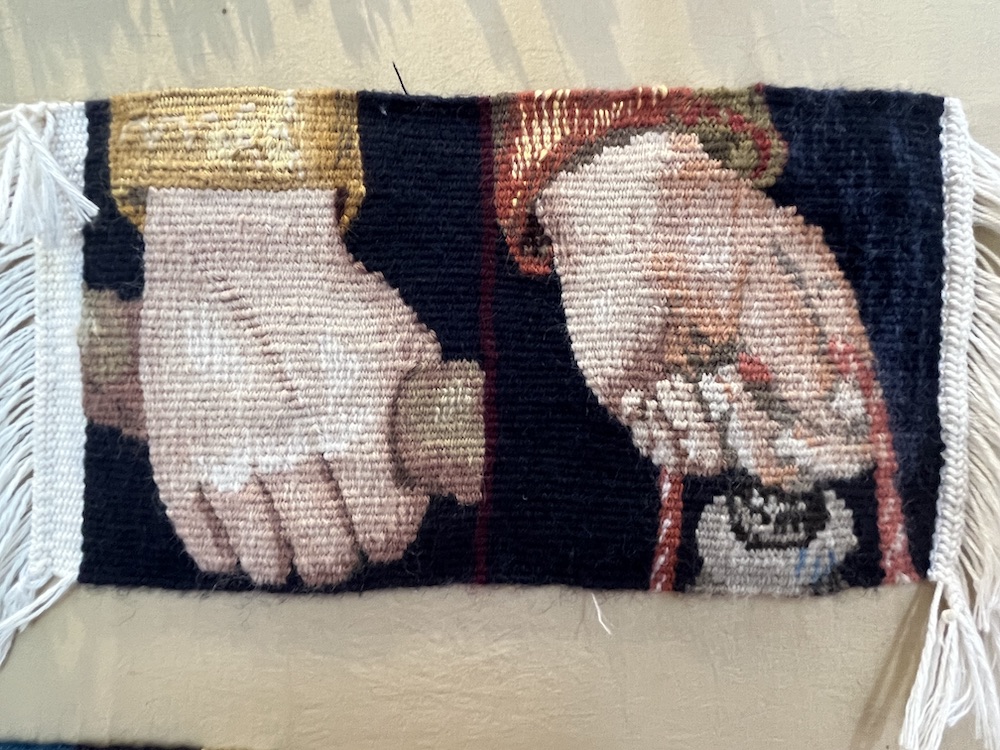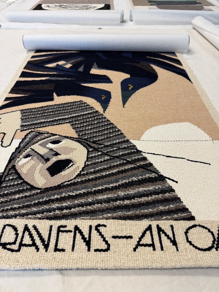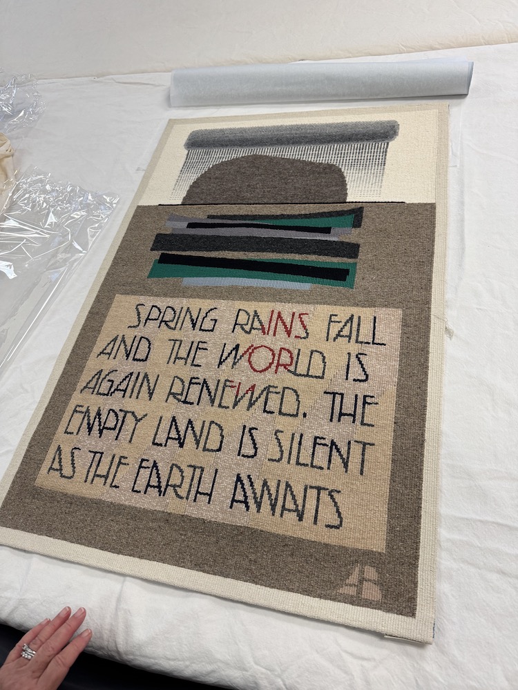 And another moving moment of this day was meeting John Brennan and Anna Wetherell. John was also one of Archie’s first students. I was one of his last, yet we are are rather close in age. John and Elizabeth and Anna have had a lifetime of weaving tapestry. I have had a lifetime of weaving, but I didn’t come to tapestry until just before the turn of the century–a mere 25 years ago or so. In the photo Anna is giving me a large format postcard of the Murmuration Collaboration which I have been following for some time now. I was able to buy the catalog, and the group has a substack site with detailed images and essays by the weavers who participated in this project.