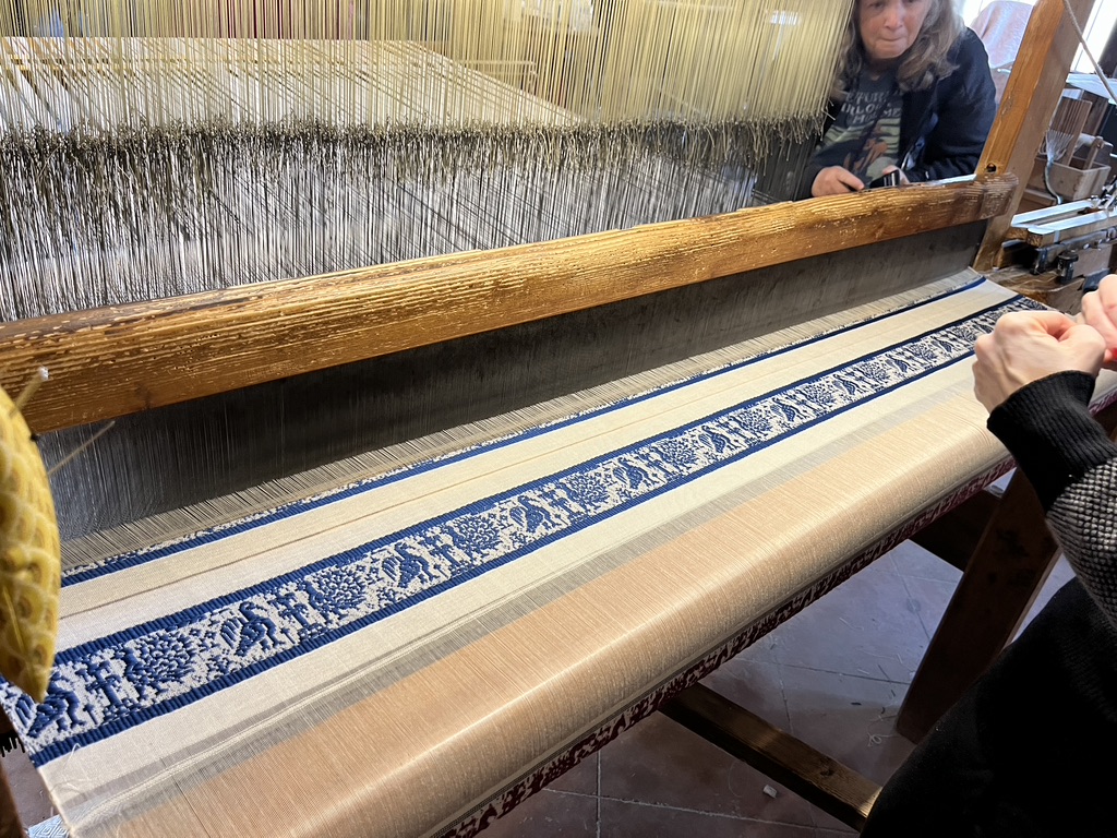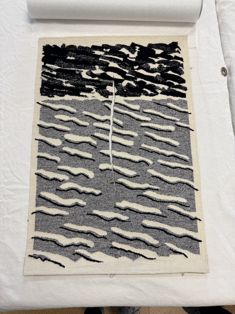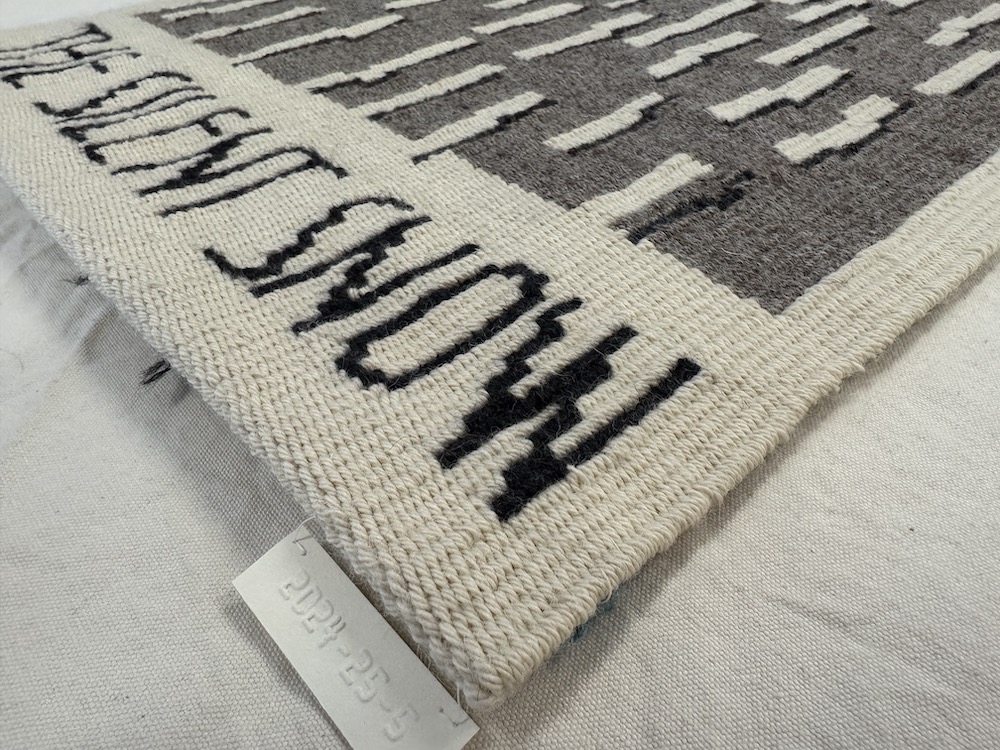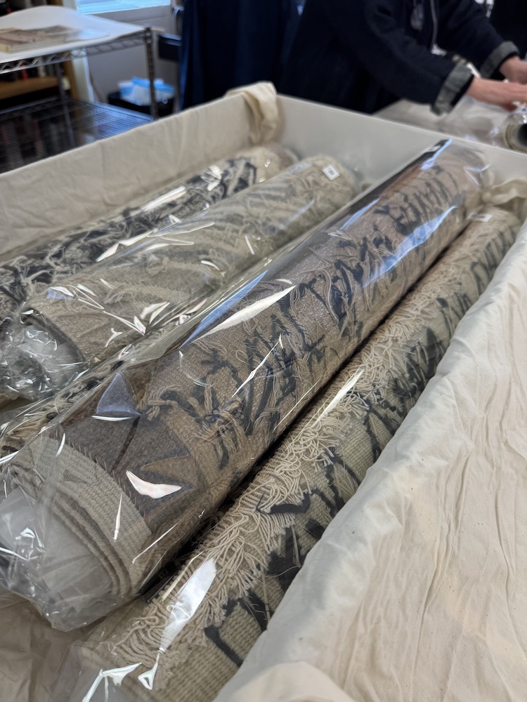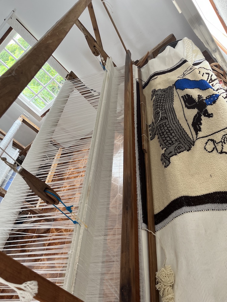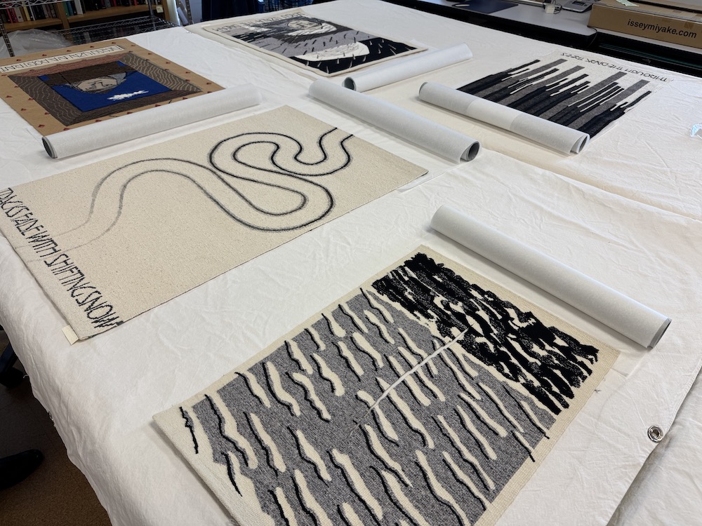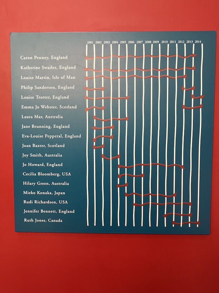 And another moving moment of this day was meeting John Brennan and Anna Wetherell. John was also one of Archie’s first students. I was one of his last, yet we are are rather close in age. John and Elizabeth and Anna have had a lifetime of weaving tapestry. I have had a lifetime of weaving, but I didn’t come to tapestry until just before the turn of the century–a mere 25 years ago or so. In the photo Anna is giving me a large format postcard of the Murmuration Collaboration which I have been following for some time now. I was able to buy the catalog, and the group has a substack site with detailed images and essays by the weavers who participated in this project.