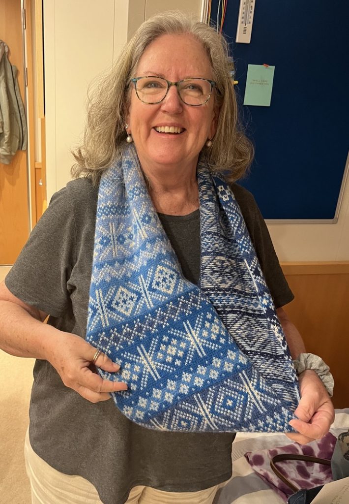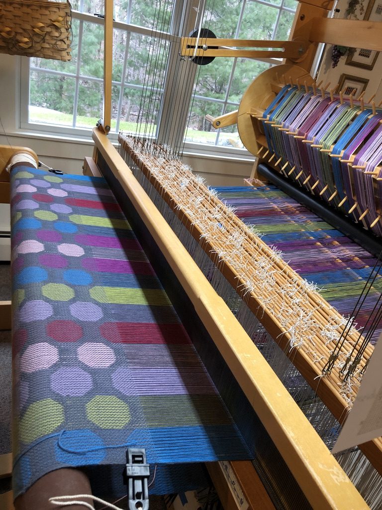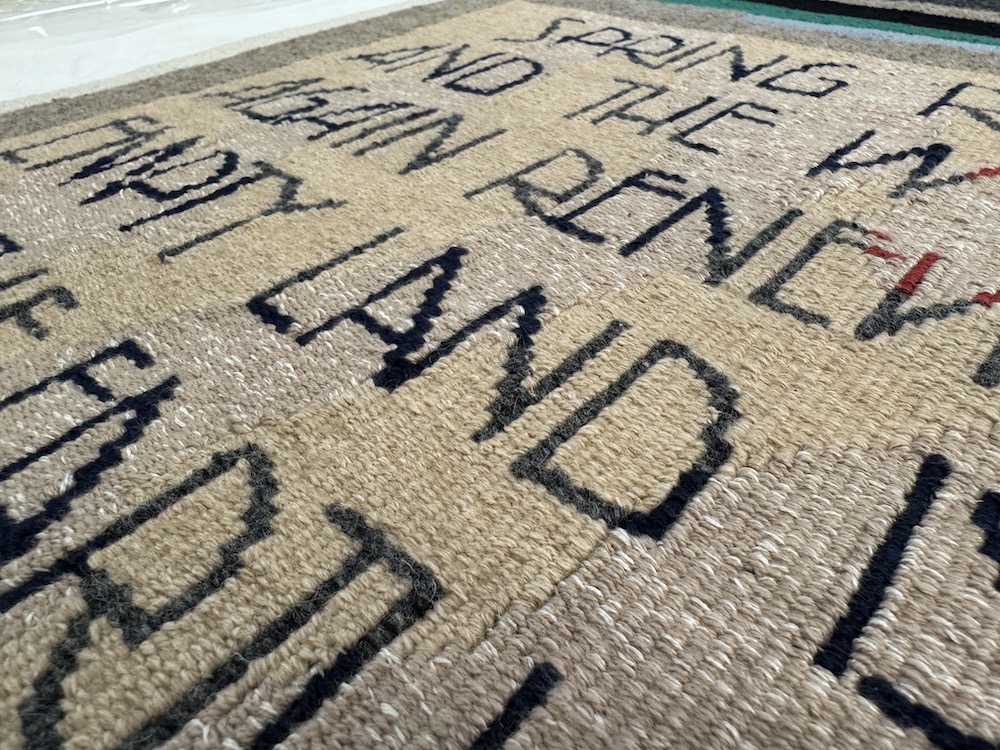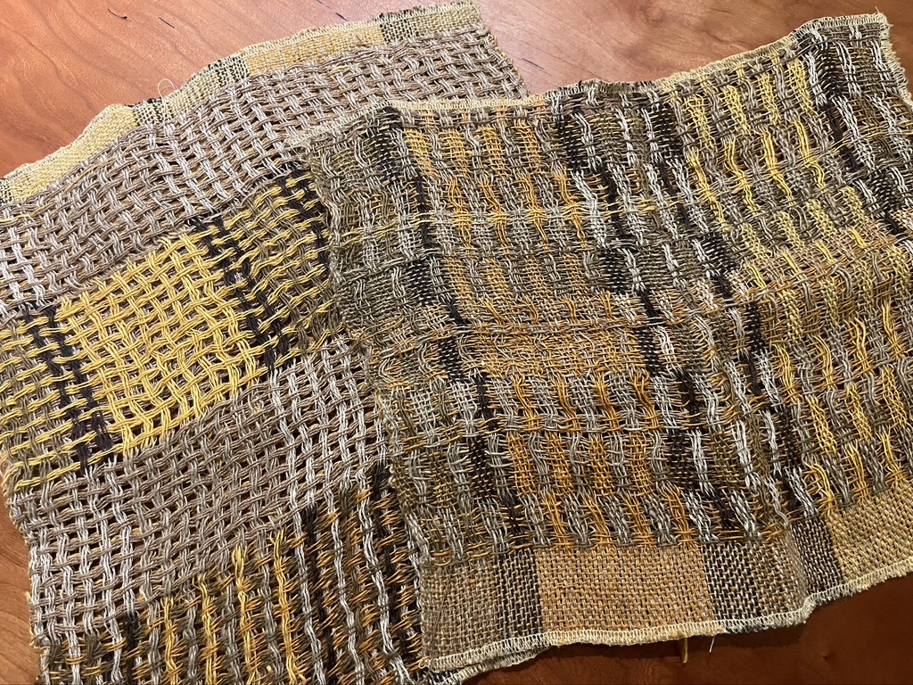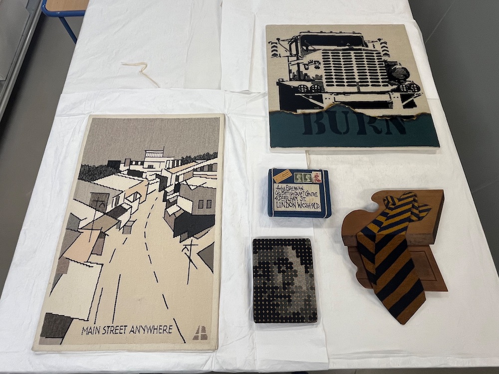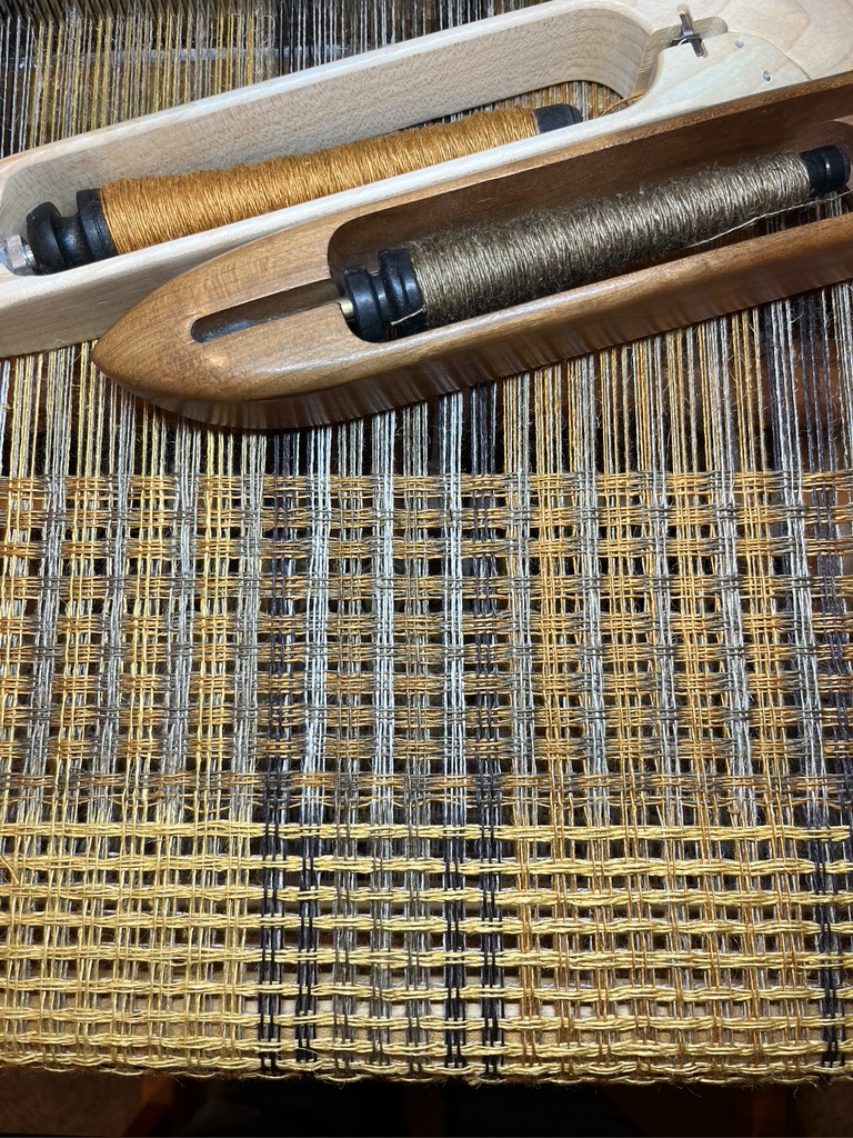 And another moving moment of this day was meeting John Brennan and Anna Wetherell. John was also one of Archie’s first students. I was one of his last, yet we are are rather close in age. John and Elizabeth and Anna have had a lifetime of weaving tapestry. I have had a lifetime of weaving, but I didn’t come to tapestry until just before the turn of the century–a mere 25 years ago or so. In the photo Anna is giving me a large format postcard of the Murmuration Collaboration which I have been following for some time now. I was able to buy the catalog, and the group has a substack site with detailed images and essays by the weavers who participated in this project.