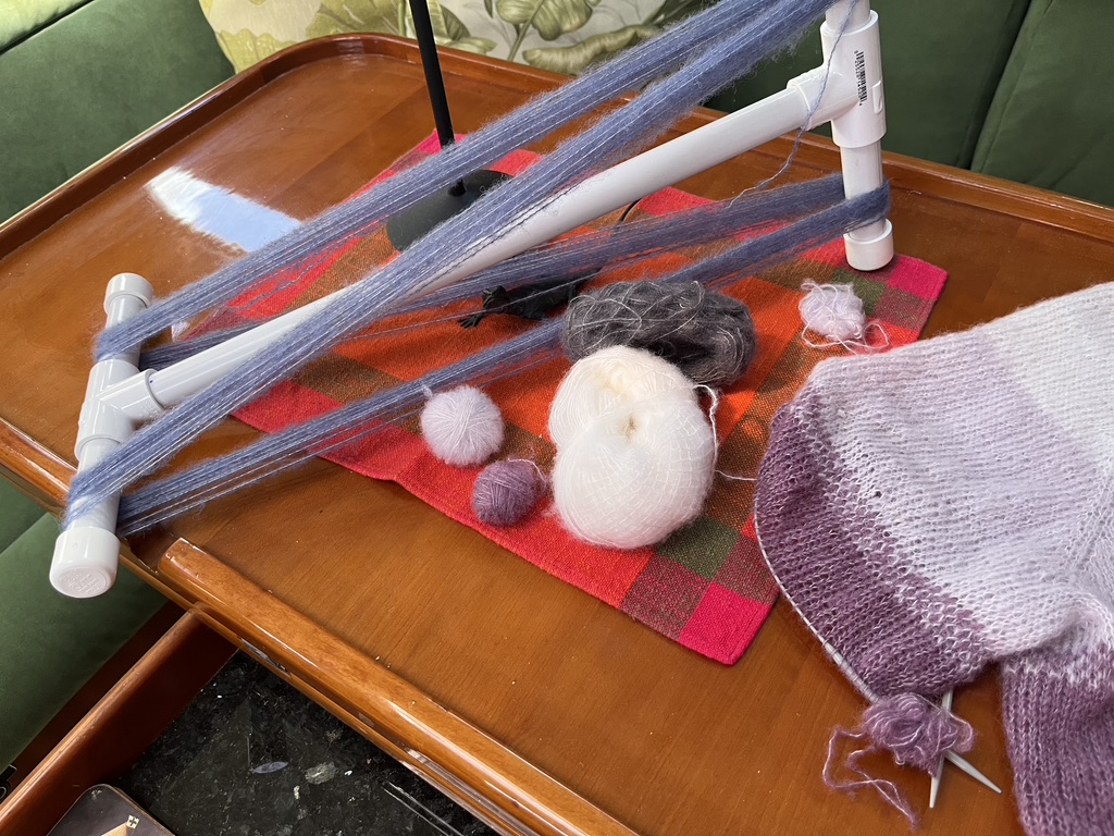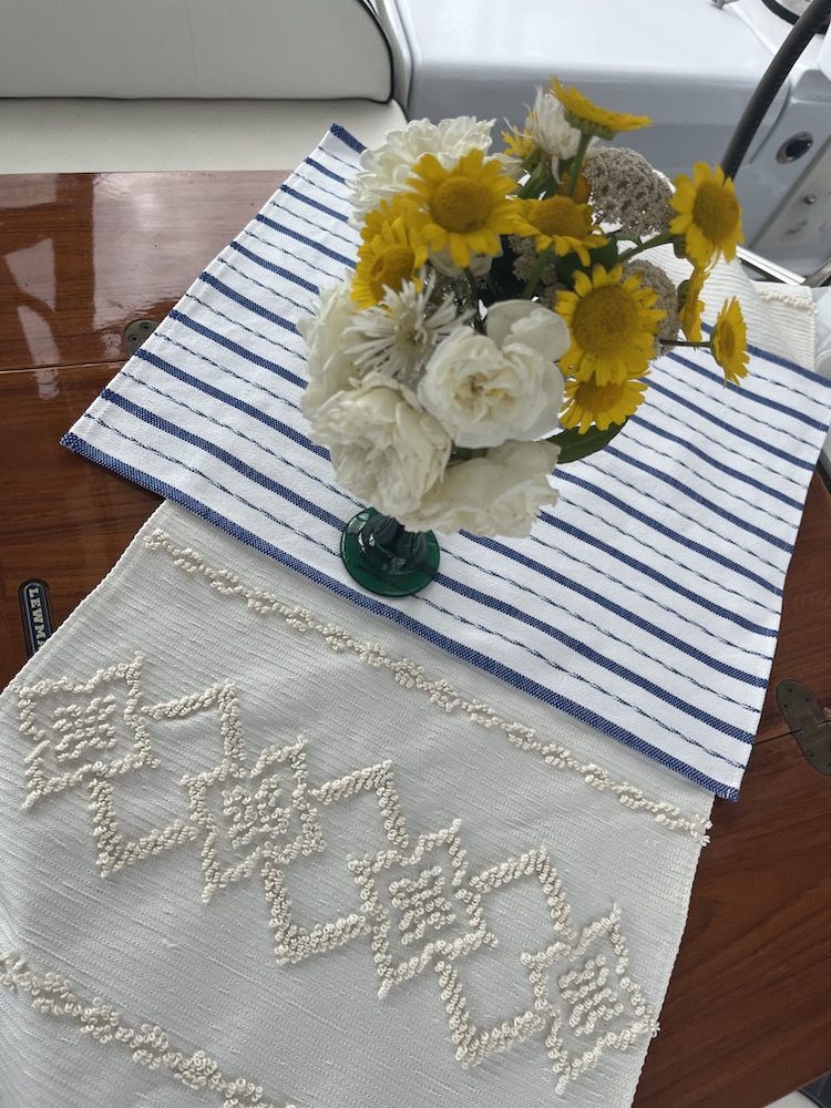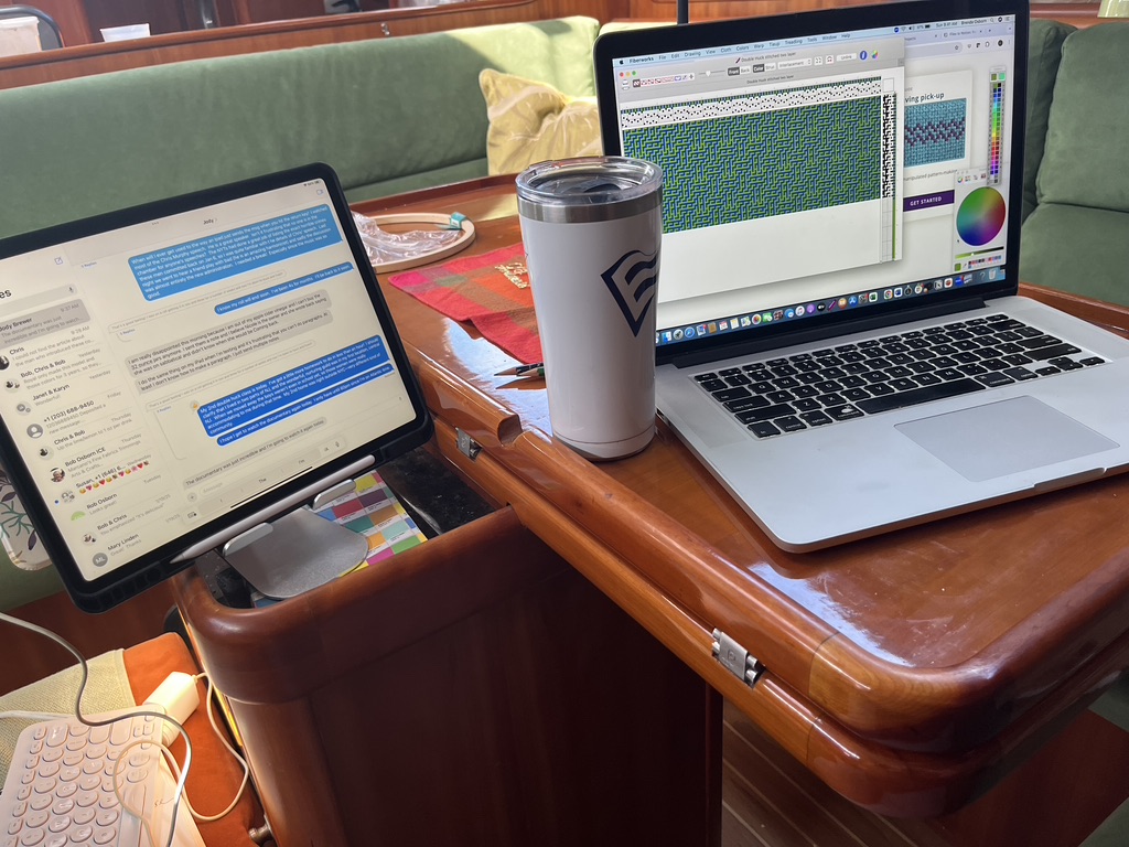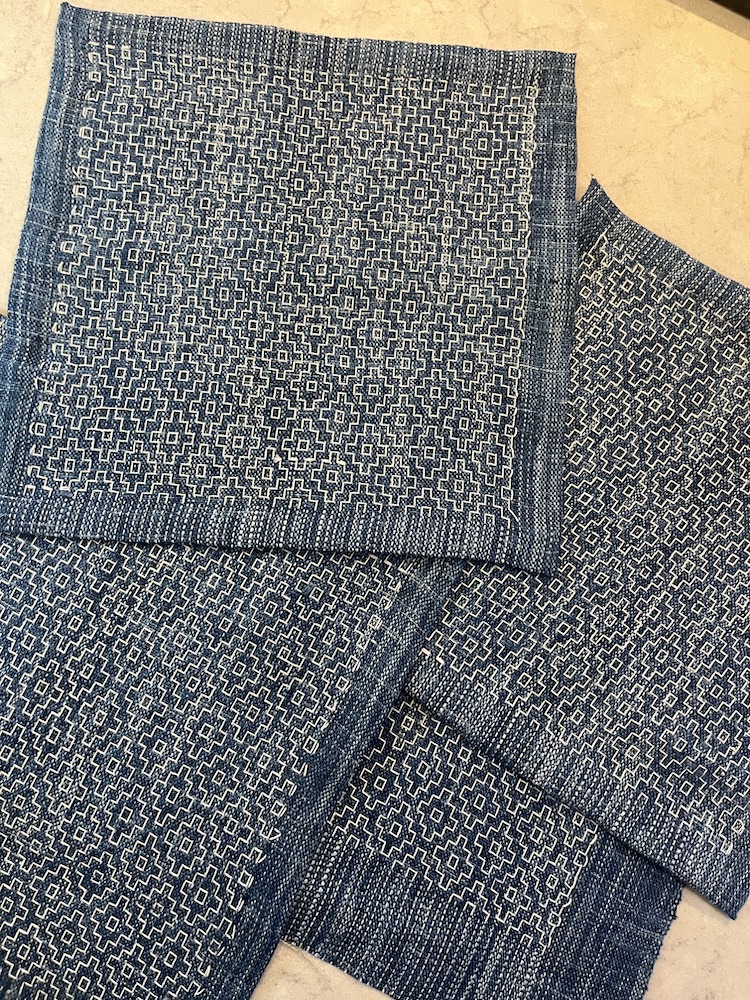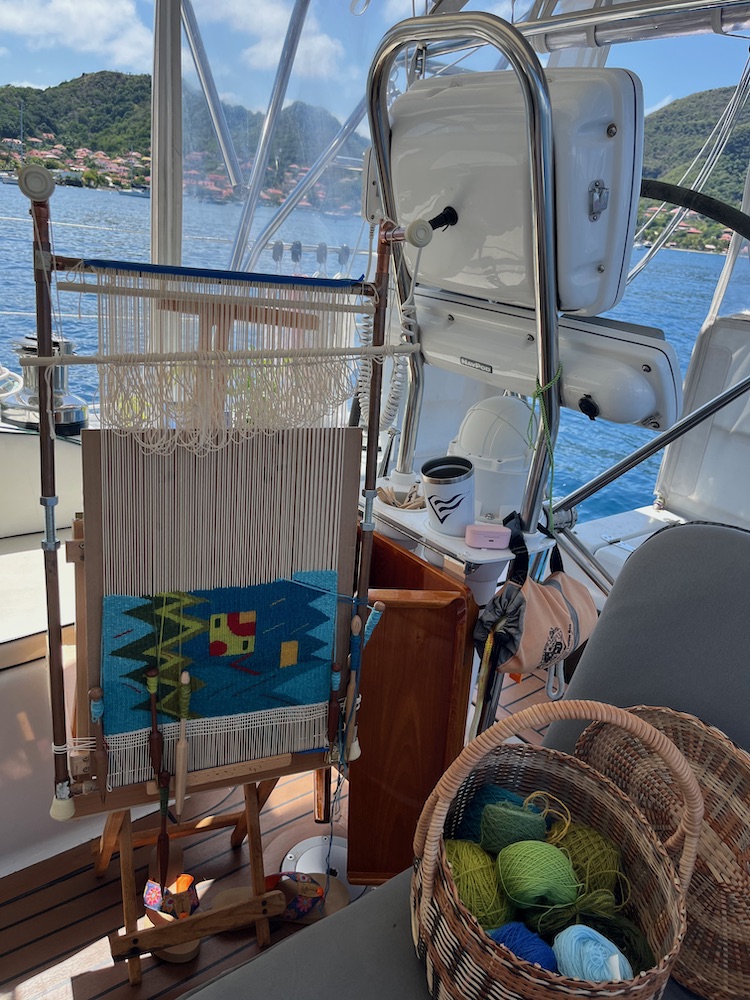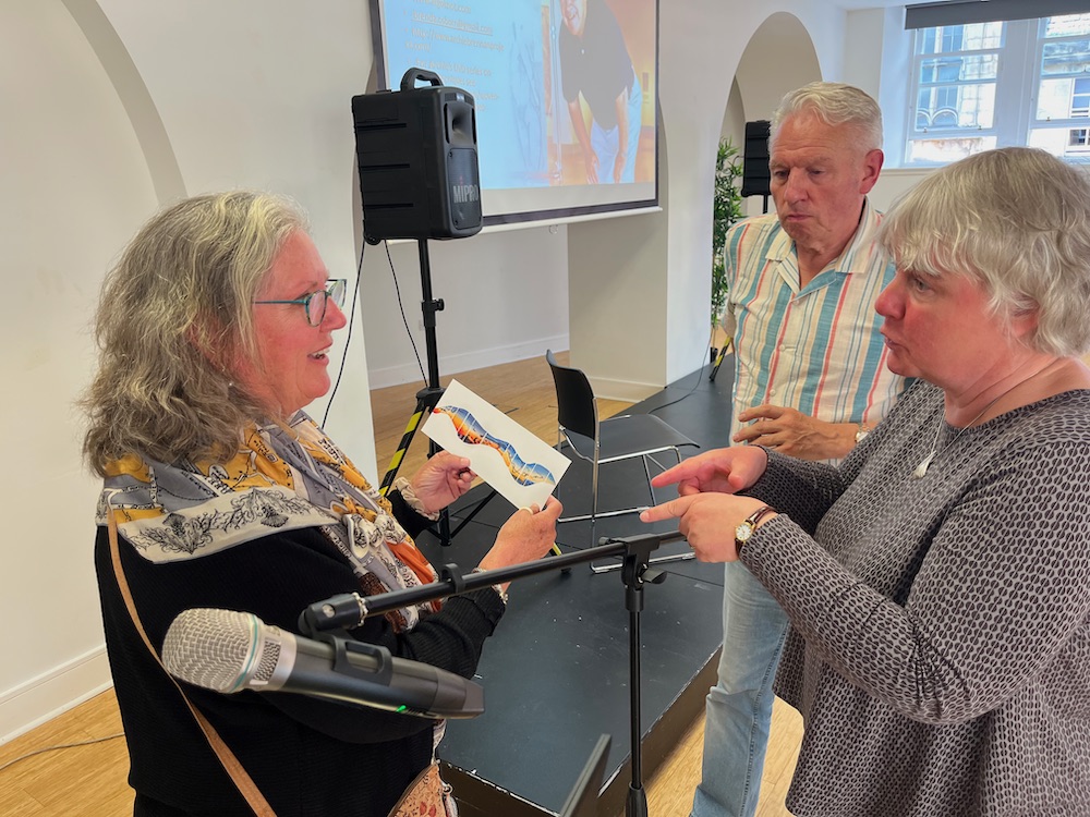 And another moving moment of this day was meeting John Brennan and Anna Wetherell. John was also one of Archie’s first students. I was one of his last, yet we are are rather close in age. John and Elizabeth and Anna have had a lifetime of weaving tapestry. I have had a lifetime of weaving, but I didn’t come to tapestry until just before the turn of the century–a mere 25 years ago or so. In the photo Anna is giving me a large format postcard of the Murmuration Collaboration which I have been following for some time now. I was able to buy the catalog, and the group has a substack site with detailed images and essays by the weavers who participated in this project.