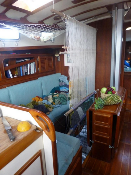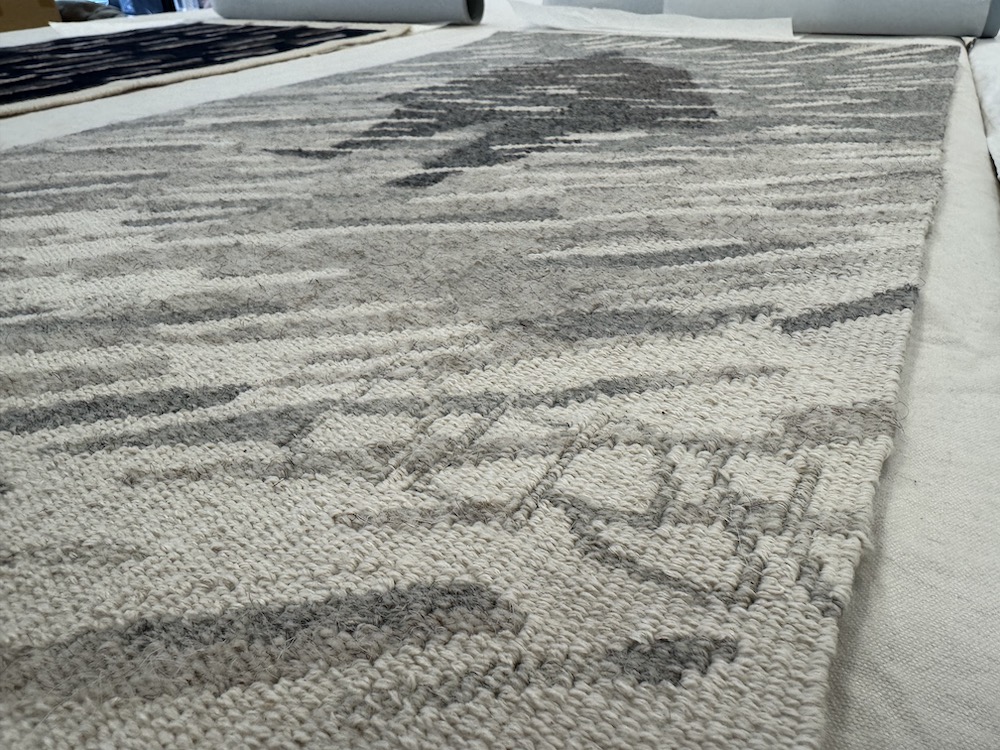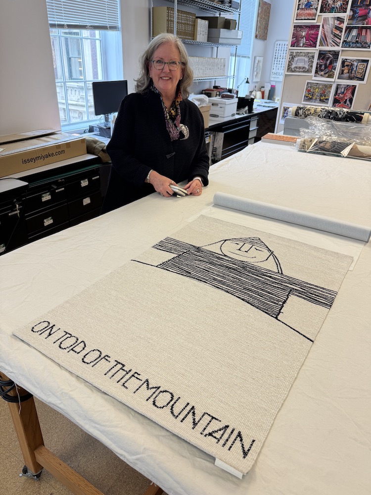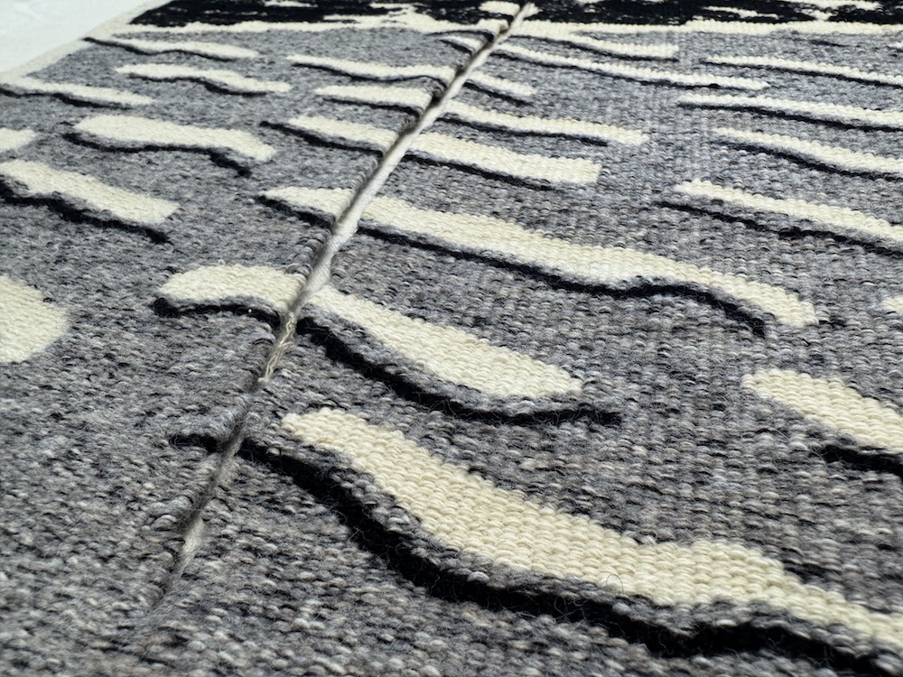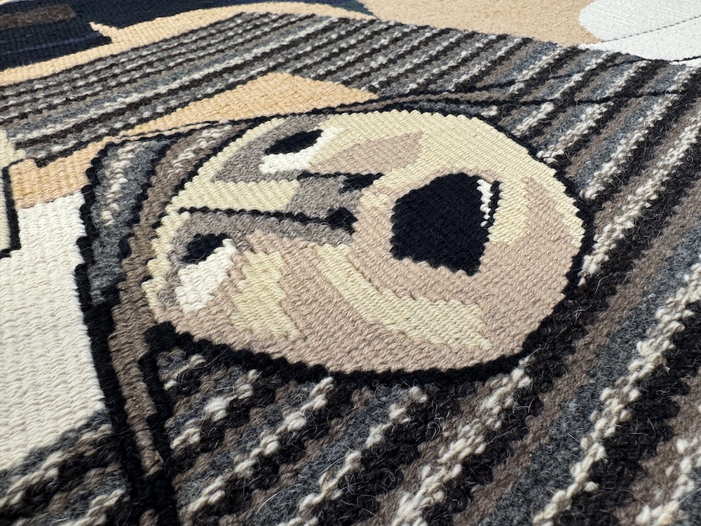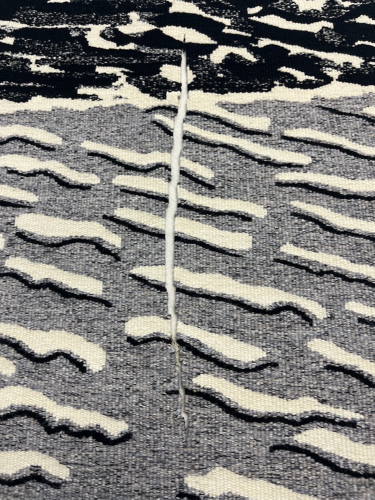 Here Cecilia is showing me how Archie wove the illusion of a tear in this piece. As you can see he actually mailed the tapestry without packaging it. It is a package itself afterall.