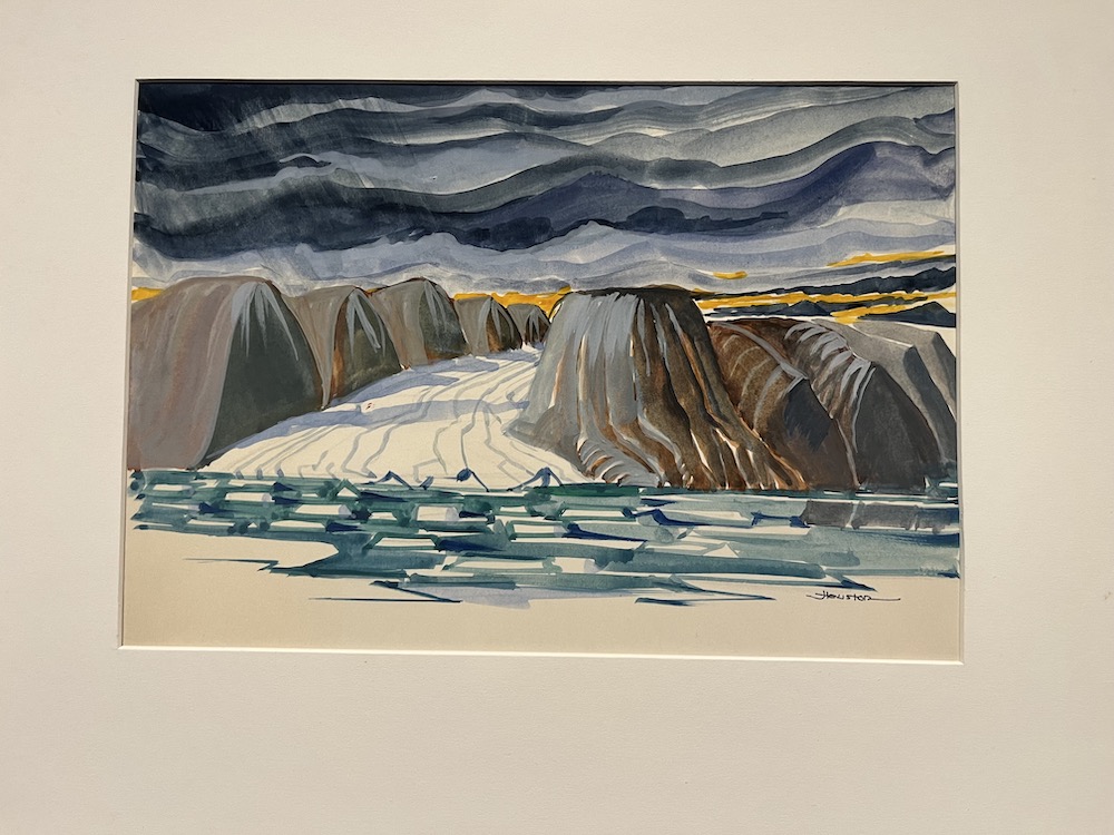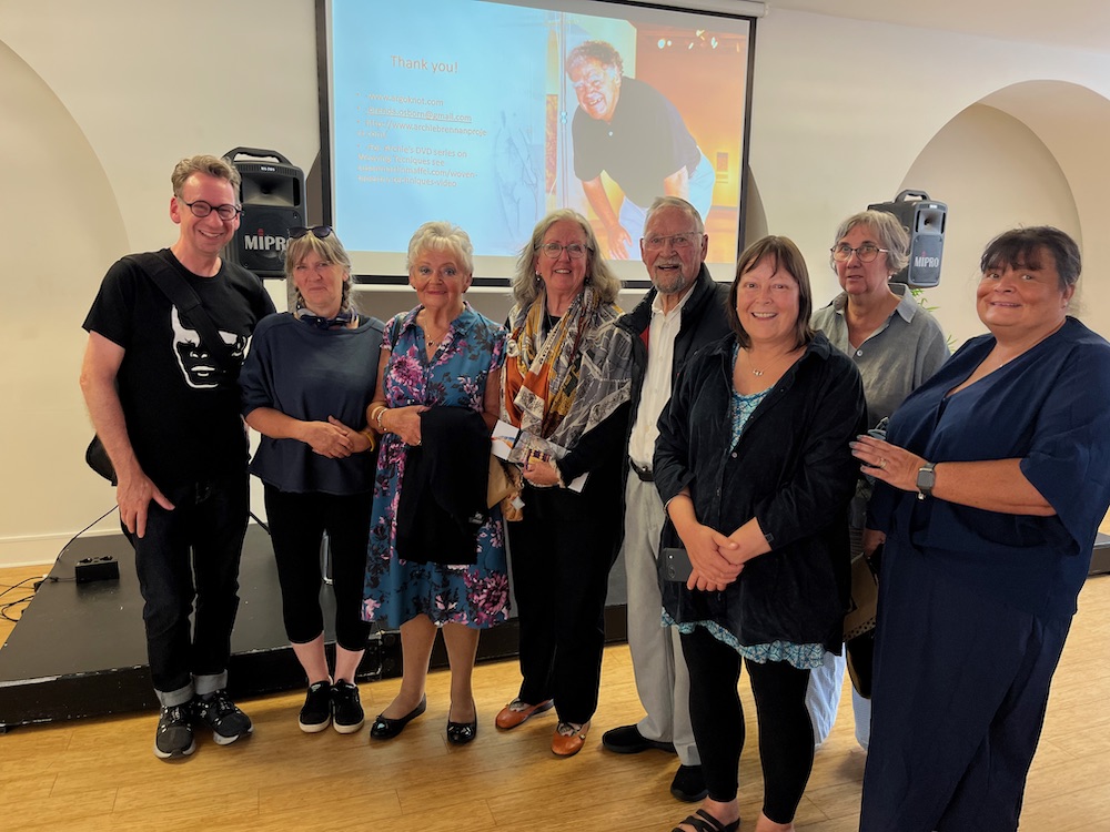 Two days later I gave my talk about Archie at the Dovecot Studios. As I was standing at the podium about to begin, a group of people walked in who had saved the front row for themselves. They were seven members of Archie’s family. Only one of his siblings is still living-his youngest sibling, Robert. One of Archie’s sisters in law was there, Elizabeth, and a number of his nieces who are the children of the sister in law. I even met Archie’s godson. And look at us all standing in front of one the slides from the presentation. Archie is looking down on us.