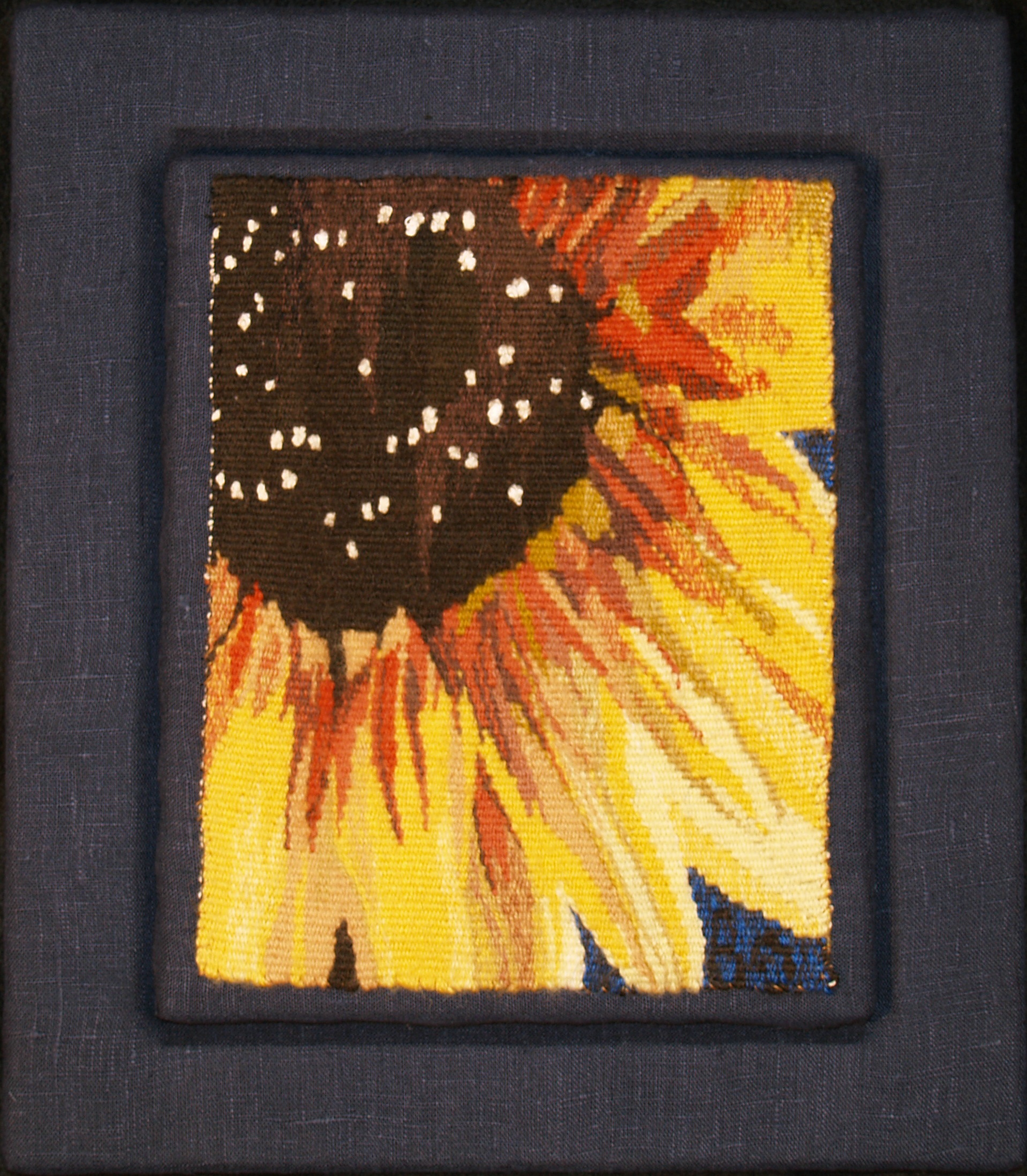 Cotton seine twine warp, with wool weft. 8 ends per inch. This piece was woven sideways from the way it is displayed. The white seeds were woven in a technique called “flying shuttle.”
