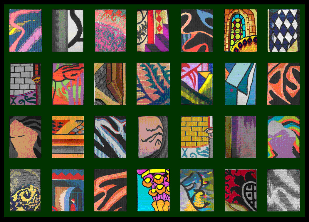 2005. A collaborative project where each weaver reinterpreted a small detail from the 14th c. tapestry. Each detail is woven at 8 epi, 8″ x 5″, and uses a particular shade of dark green Paternayan yarn as part of the design.