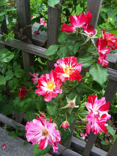 On my daily walks I pass a certain fence that is about 100 feet long and bedecked in this lovely candy striped rose.