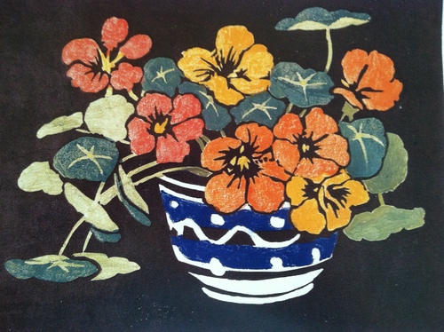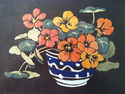 Several wood block prints, including the nasturtiums I’ve been playing around with for a tapestry design