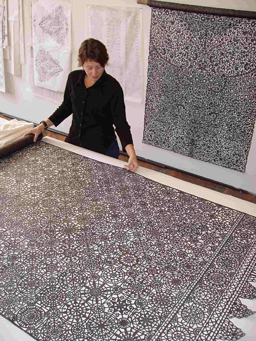 The one piece that has intrigued me since leaving the exhibit is Piper Shepard’s “Dome.” Although we could not take photos of anything in the exhibit, and I was not impressed with the photos in the catalog (which was sold out anyway and had to be ordered from Muskegan Museum), I have enjoyed reading about Ms. Shepard’s work online. Her piece titled “Dome” was made from a large sheet of muslin fabric that had been treated with gesso and graphite to have a very dark surface. She then cut out tiny shapes in the manner of cut paper, like Scherenschnitte. She displays these works as if they are made of heavy metal, hanging from sturdy steel brakets that hold them out from the wall. Light creates marvelous shadows, and any breath of air gets the large work to undulate, giving the viewer the realization that this is a very light and fragile material. It’s a beautiful blend of bold, fragile, delicate and large all at once!