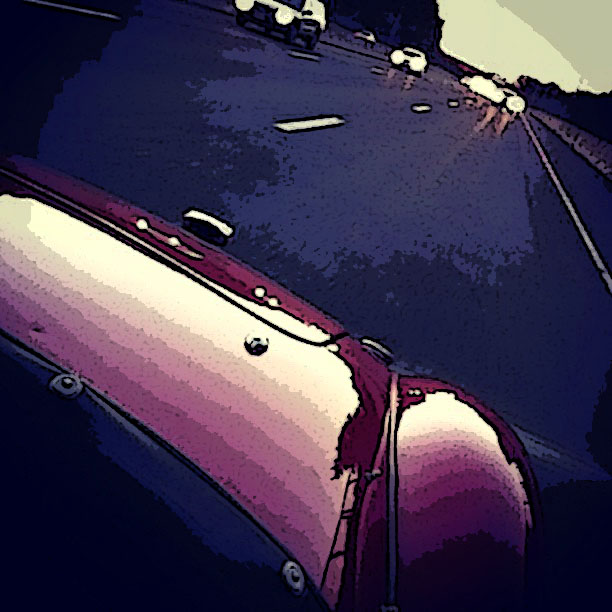 And I’m thinking about a photographic image that Christopher took from the passenger seat of our new car while facing backwards. The photo was taken at dusk with with the fading light in the distance while cars are zooming along into the night, away from the light. The image has a lot of motion and light and dark in it….it intrigues me.