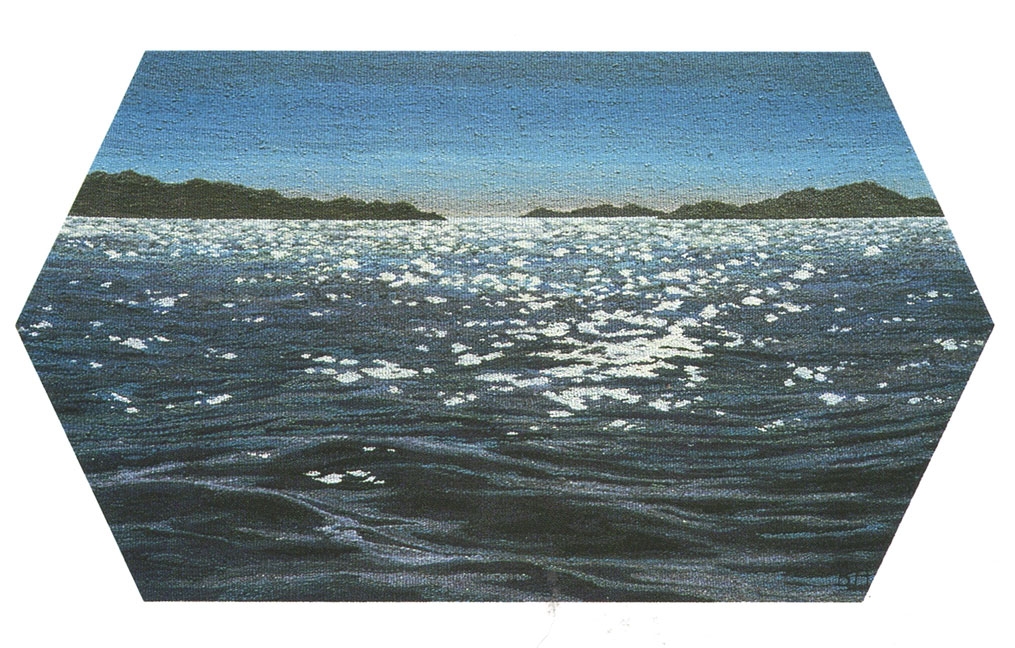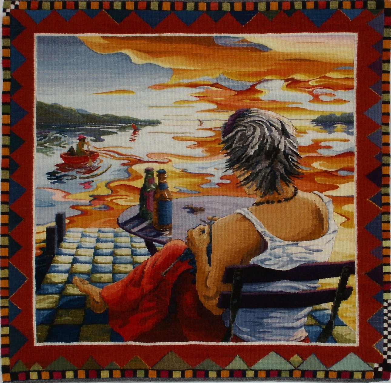 AWARDS FROM NEW ENGLAND WEAVERS’ SEMINAR: for “Sunset on Wilson Cove”: 1st Place Tapestry and Transparency, Judges’ Choice, People’s Choice, Textile Arts Center “Best in Tapestry,” Rebecca Dea Award for First Time Entrant. NEWS 2015.