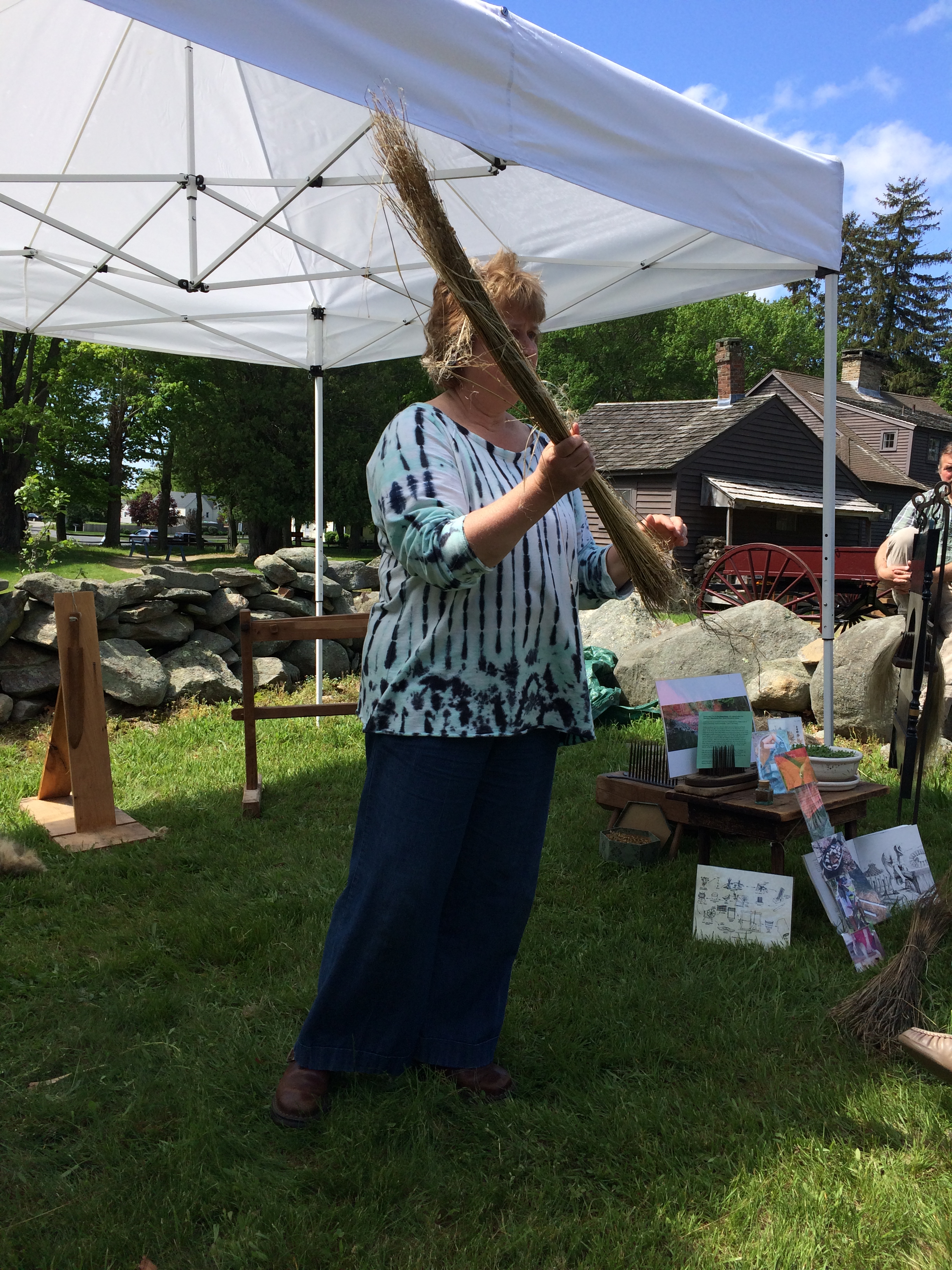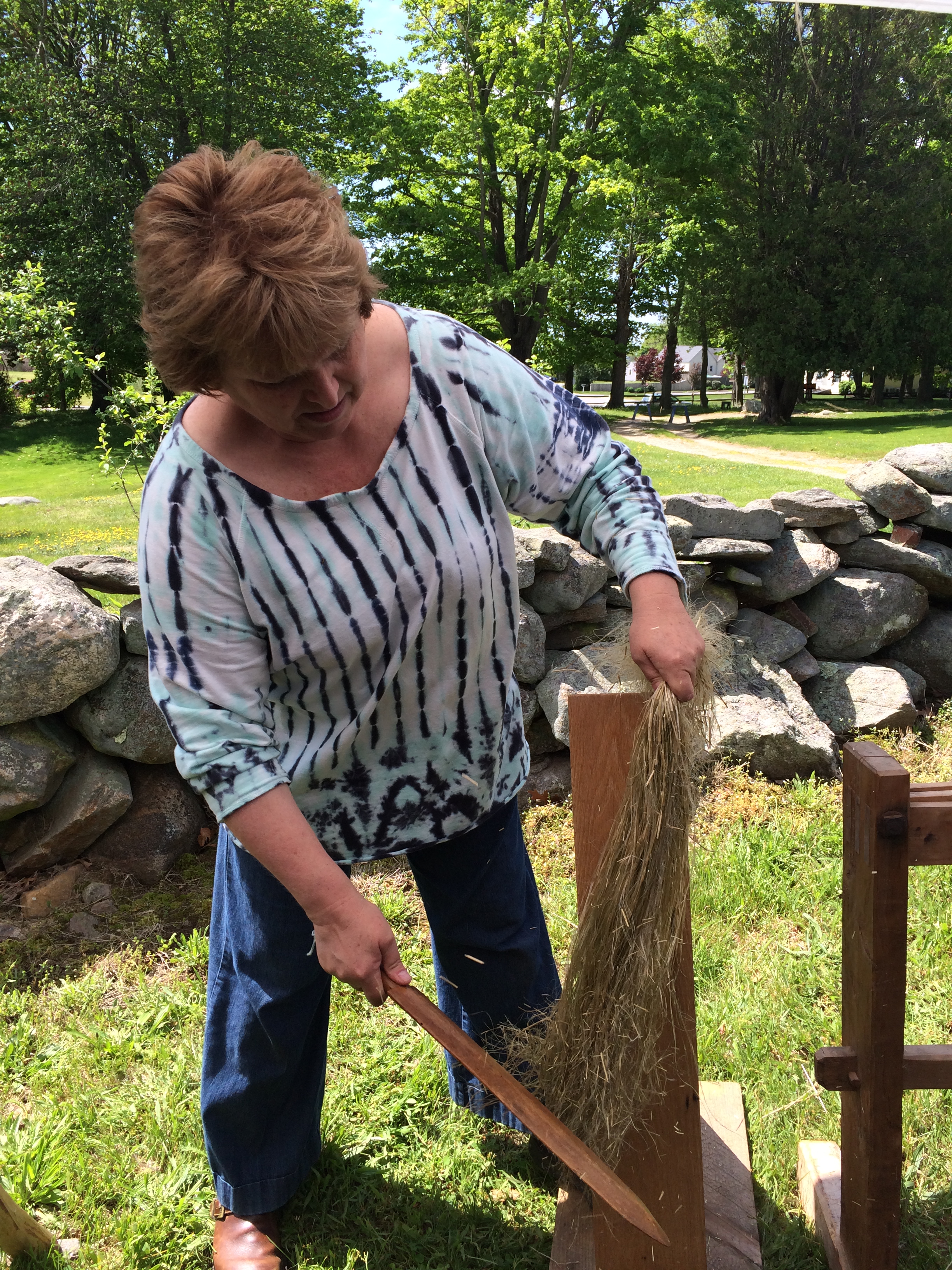 Gina Gerhard does 18th century textile demonstrations throughout New England and she certainly knows a great deal about growing flax, harvesting it and processing it for spinning into beautiful line linen. While I know the various stages of preparing flax stalks for spinning, I had never seen the entire process done live, right before me! Gina made it look easy, but she has had a lot of experience, and she was only processing one bundle for us. I’m sure an entire harvest would be a huge undertaking.