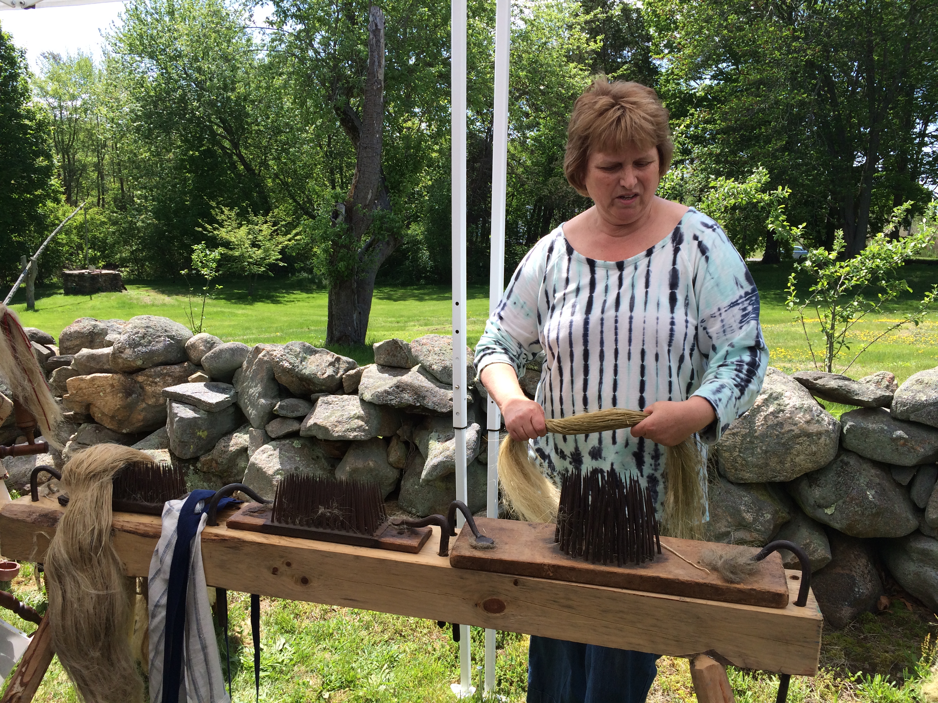 This photo shows Gina’s three hackles (all up!), getting finer as she progresses through the hackling. Aren’t her bench dogs great?? I talked to the blacksmith in one of the nearby barns about getting a set.