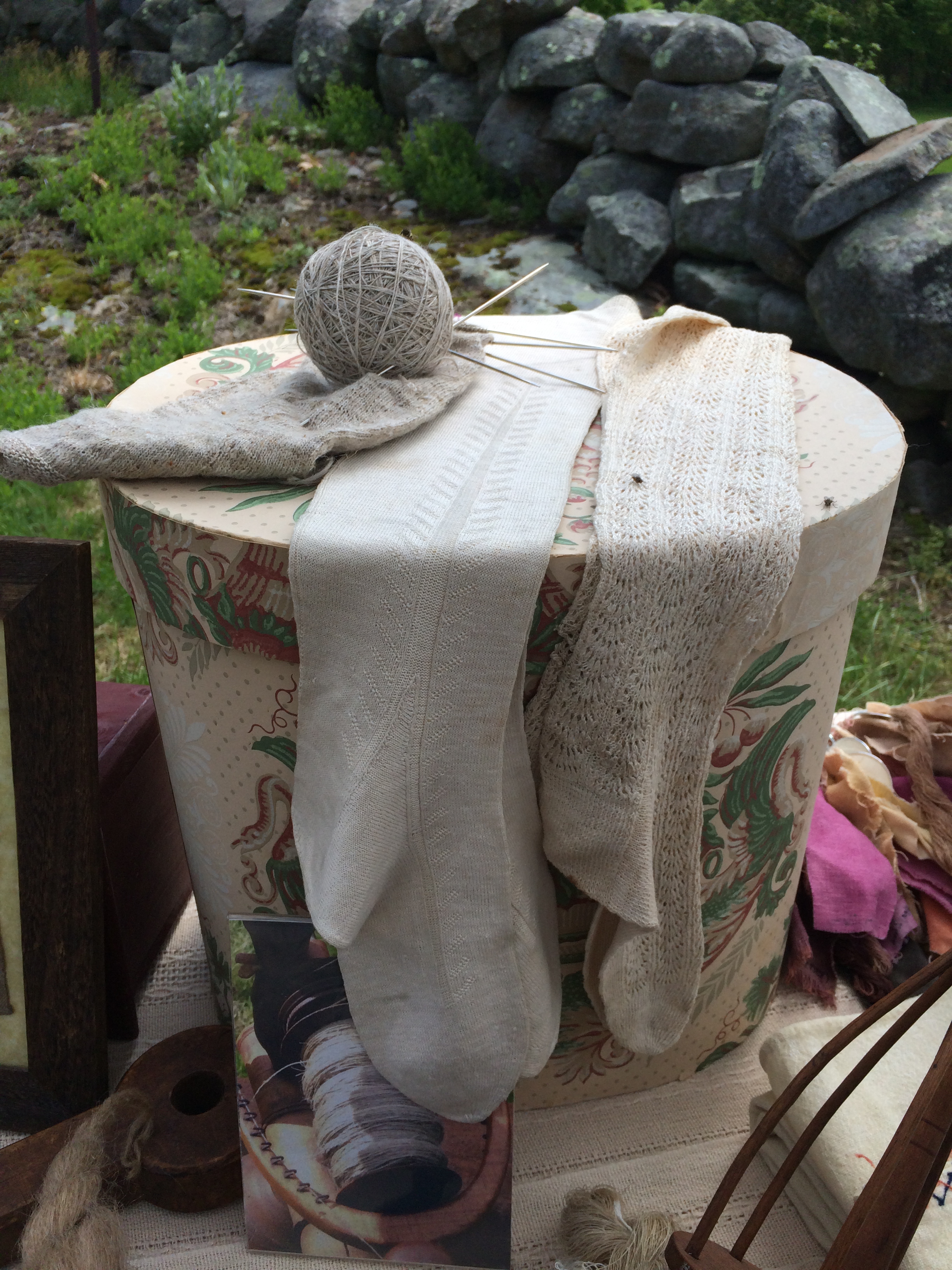Amazingly, she grows her own flax, starting with about 5 lbs. of flax seed. In her area of New Hampshire an historic flax pond has been identified, and she hopes to use it in the future to rett (or rot) her flax bundles. At the moment she uses a large outdoor tub to rett her flax, and it takes about 4 to 6 weeks. Having a pond that can be dammed with shallow, still water with a bed of stones at the bottom gets the job done much faster, perhaps only 4 to 5 days if things are perfect.