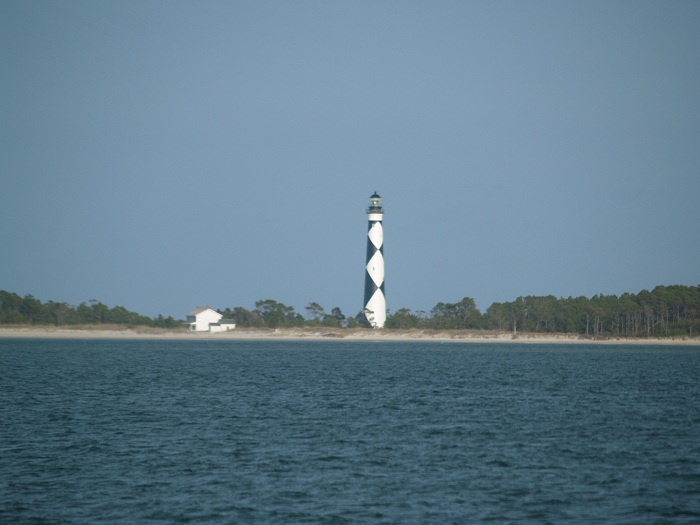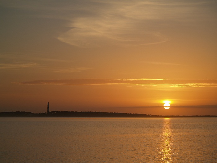 The lighthouse at Cape Lookout at sunset. The light flahses for one second every 15 seconds, and Bob managed to get it!–you have to have great eyesight to see that tiny point of light in this photo!