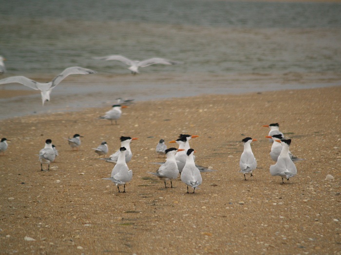 These shore birds, which I can’t identify positively (they might be a type of tern–Caspian? Forster?) really scolded me for invading their territory. I am always impressed at how fearless most birds are. En masse these guys were determined to get me off their bit of beach!