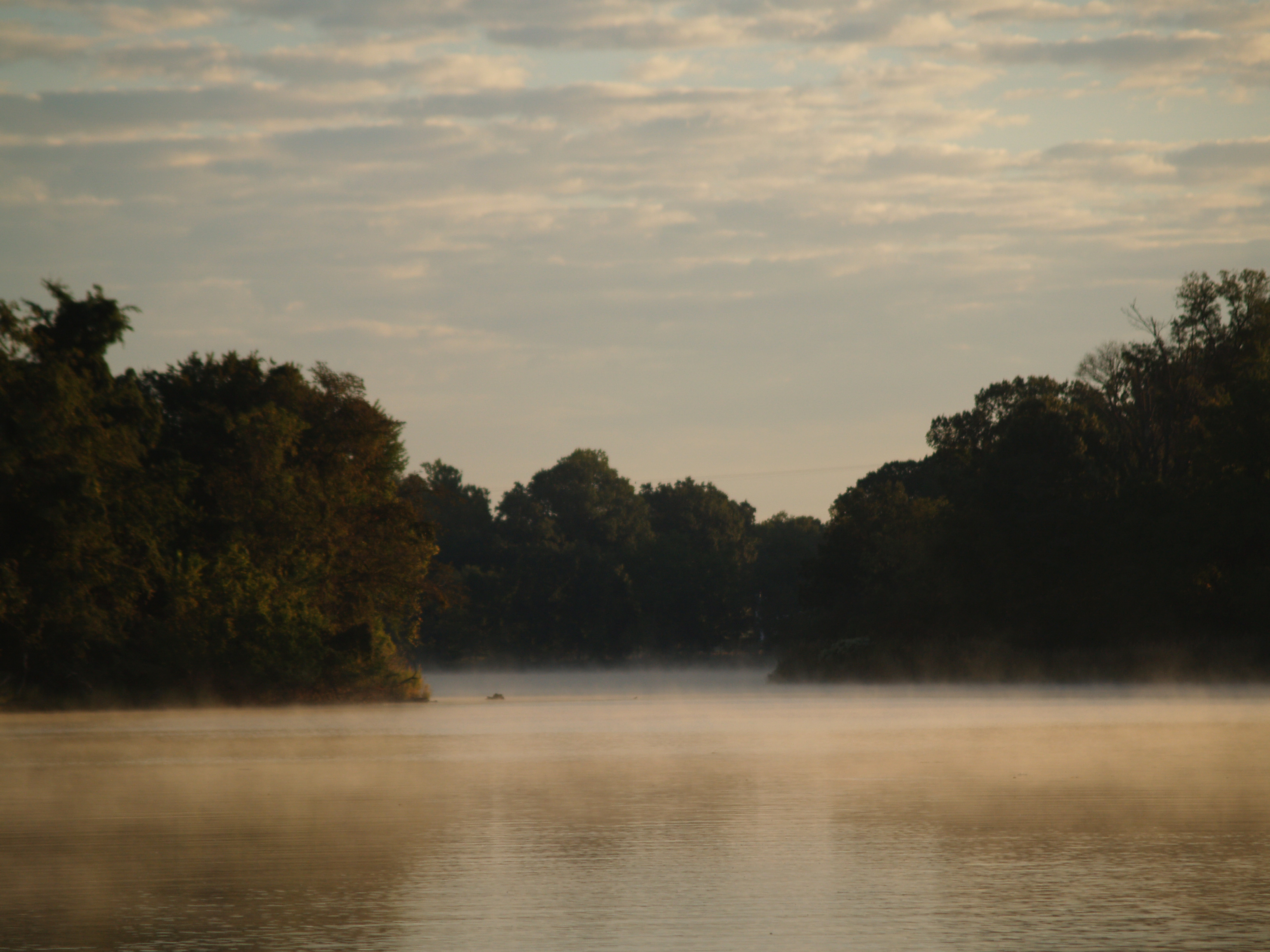 This photo was actually taken early the next morning when there was a light breeze ruffling the surface and a morning mist.
