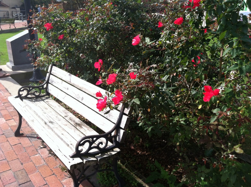 Every evening that there are boats on the dock these volunteers host a wine and cheese reception for the sailors. Here I am with Gus on the left (of the photo) and former mayor Carl on the right. Can you see my rose? Fred grew roses until his death in the mid-2000s, and every evening at the reception he would give a rose to each woman present! His rose bushes have now been transplanted to the harbor’s edge.