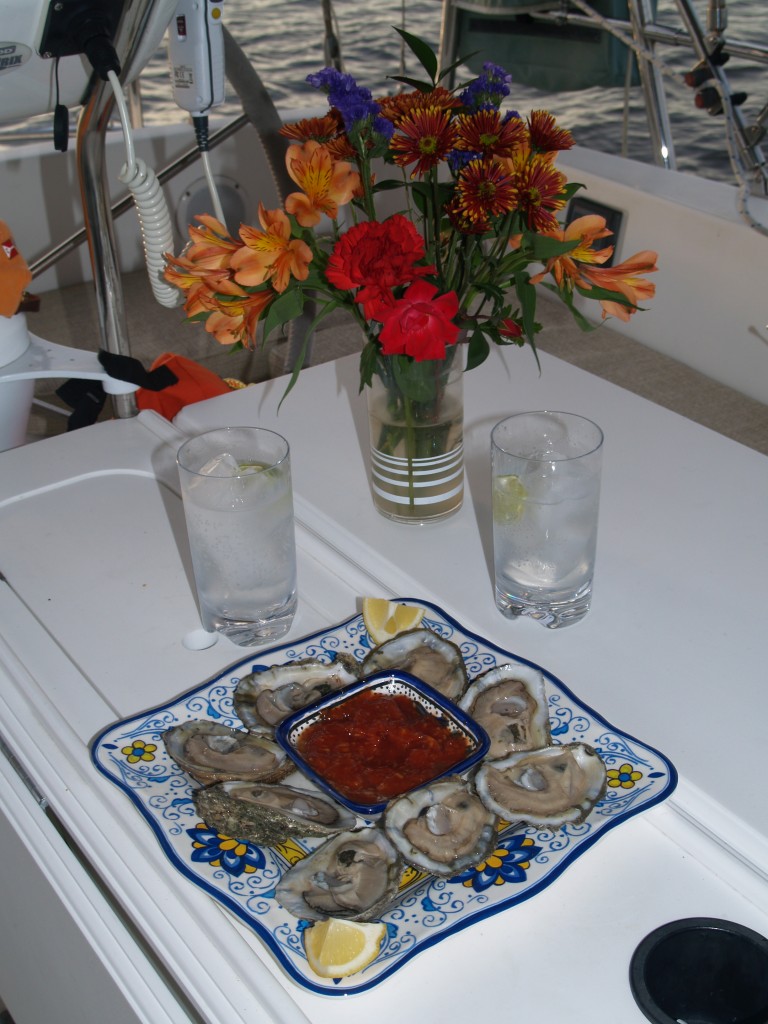 We ended the day with a platter of oysters on the half shell and a gin and tonic! We had tucked into those oysters already when Bob realized we really should document it! So we cleaned up the empties, refilled the platter and took the shot! Doesn’t it look tantalizing? I can assure you it was!