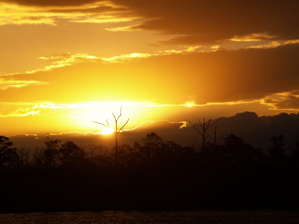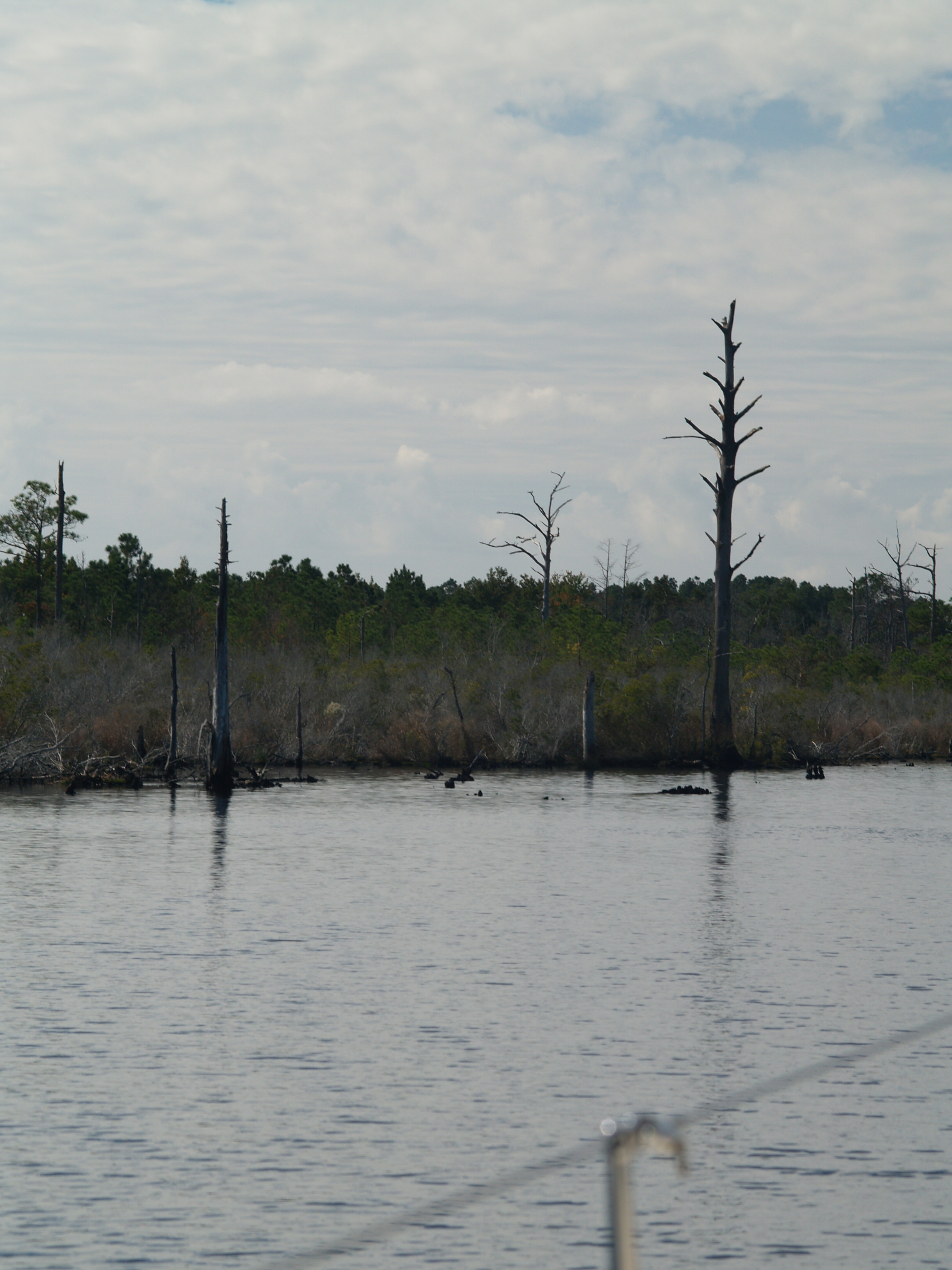 Since then we have traveled down the Alligator River which was quite different than I expected. While the Dismal Swamp was anything but dismal, the Alligator River was anything like its name. I was expecting quite a lush jungle, and while I’d heard that there are no longer alligators there, I did expect to see lots of other wildlife. We had heard from other sailors that they had seen both deer and black bear on the Alligator. I think “dismal” is a far better word for this stretch of water. There were lots of low stunted shrubs, and half the trees here were dead while the other half are not far behind. It was very desolate. A hundred years ago this was a well known place for whistling swans, but we saw none. No ducks or geese either, in spite of the 20 or so duck blinds in the water and some unused camps on shore. The only wildlife we saw, which was indeed quite impressive, was three bald eagles. Two of them were sitting together on the top branch of one of the many dead trees. I did not know that eagles would tolerate that kind of proximity. I can’t imagine what they were hunting beyond little rodents because we saw no evidence of life. It looked like the perfect place to originate ghost stories!
