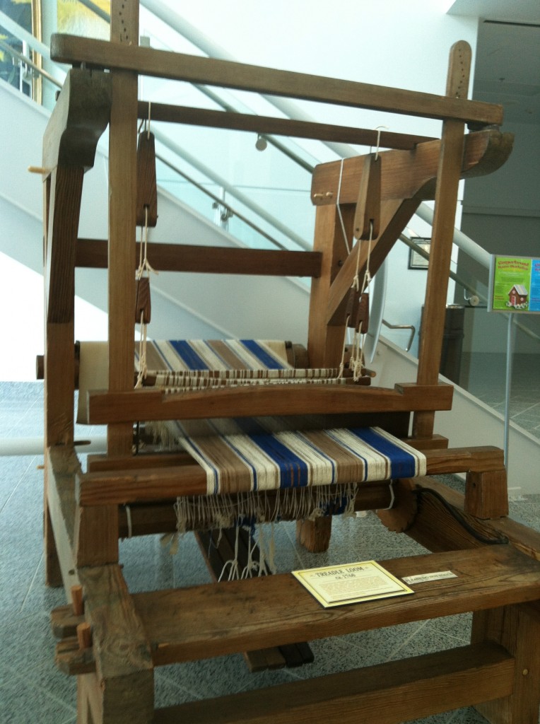 I marched right up to that loom and fondled the warp….before noticing the sign that said “DO NOT TOUCH!” Oh well….I’m sure they wanted to keep people from touching the loom, not the warp! Whoever set up the loom did a brilliant job in choosing a warp that would look appropriate to the time period: 8/2 cotton flake that could almost pass for ‘homespun’ in colors that were quite similar to the natural dye colors that would have been available in 1760. The rest of the museum proved equally fascinating to me. There were plenty of domestic artifacts from the mid 16th century when the first Europeans arrived in this area, through the mid-20th century. There was an exhibit of Lewis Hine’s photographs of young children working in the textile mills in the 19th century. Heartrending, compelling photos. The whole museum was lots of fun for me….