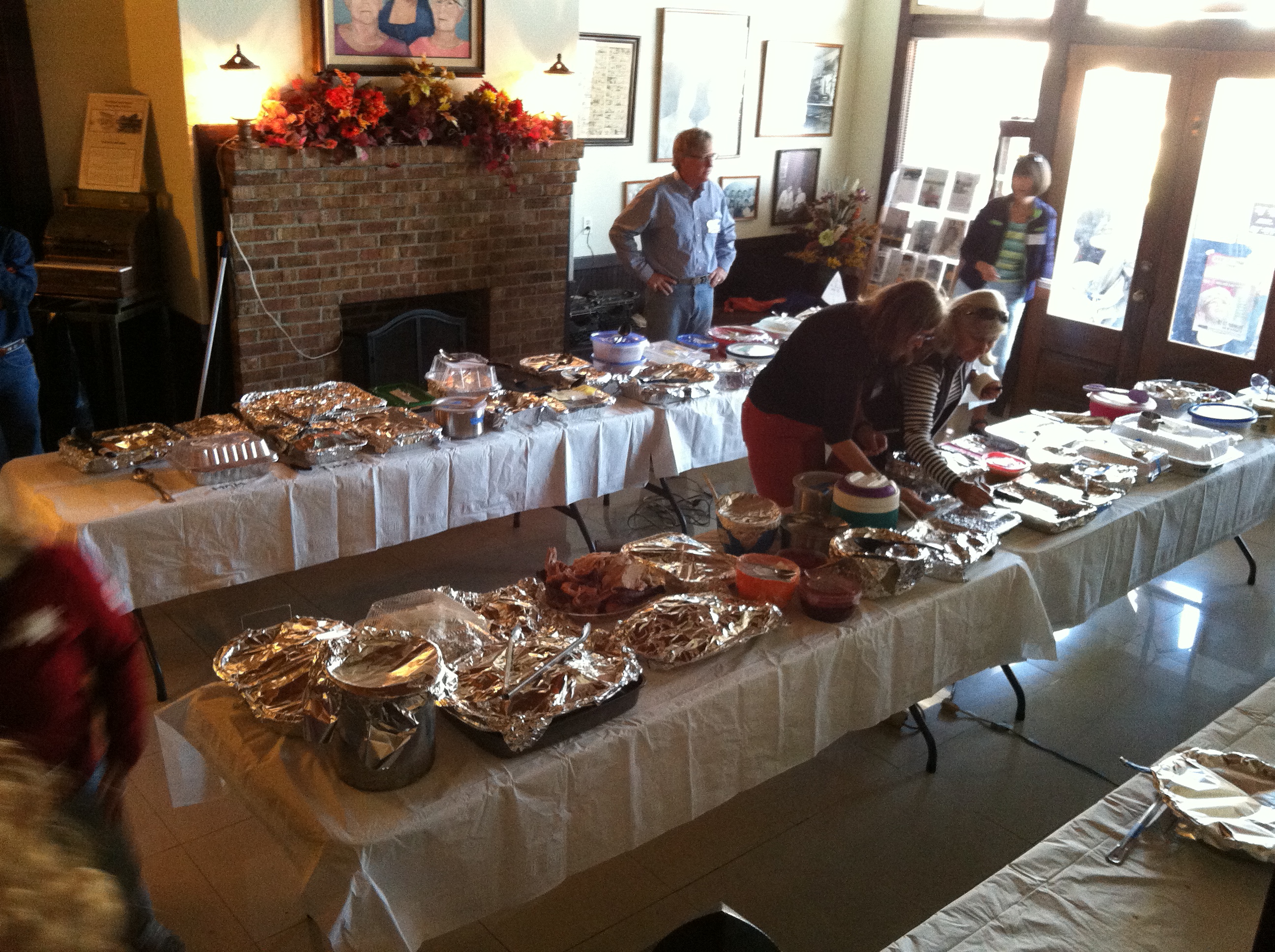 The sailors arrive at the hotel from late morning through noon bearing all the side dishes and desserts.  Three long tables are set up in the hotel lobby to hold all the platters of food.