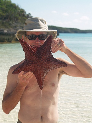 From one of these lovely beaches I walked out a ways in the clear shallow waters with Mary, from Sanity II, who had spotted this sea star as she dinghied in to the beach. When I called Bob over to see he couldn’t resist picking it up and posing.