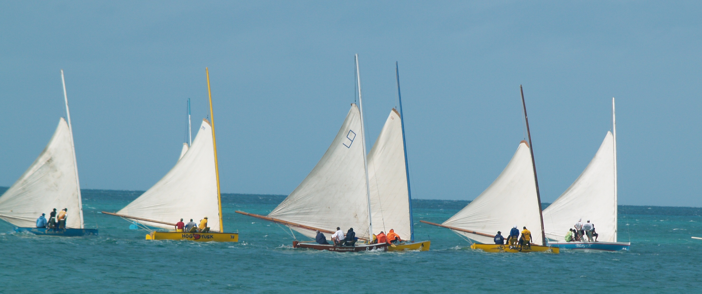 This is one crazy sport! The boats have only one huge sail, and to balance that canvas (and it literally is cotton canvas in an age when all other boats have moved on to Dacron or even more high tech synthetic materials)… as said, to balance all that canvas there are removable planks that slide under the gunwale to extend well out over the water on the windward side of the boat (that is the opposite side to the sail). The crew scramble out onto these planks, called ‘prides,’ in order to balance the weight of the boom and sail on the other side, which would capsize the boat if not for the crew hiking out on the prides. When these boats come about on a different tack, which means bringing the boom and sail to other side of the boat, the crew scrambles down the pride back into the cockpit, yanks out the pride and shoves it into the gunwale on the other side. Then they all scramble out onto it again. There is plenty of risk of injury. Just moving the pride from one side to the other offers lots of chance for getting hit by this big plank of oak, or getting fingers broken when maneuvering it. The men all end up with lots of bruises from scrambling out on these things, and they call their injuries ‘boat bites.’