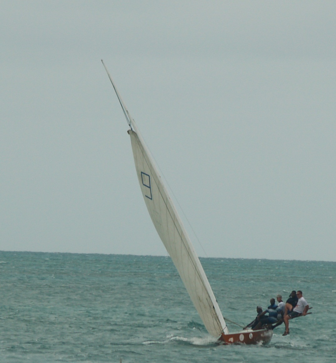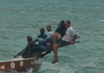 During these races there are plenty of mishaps. While you are out on the pride you hold on by locking your legs under the pride, but there is very little to hold on to with your hands. The guy farthest out has no handhold and must rely on his locked legs to keep him from falling in the water. During the first race Bob was the farthest man out on the plank when the captain realized that Bob just didn’t weigh enough to be out there. He told him to switch places, but no one was to move off the plank, so Bob had to climb over the other guys while under sail and hiked up high off the water. I don’t know how he did it. There were plenty of times on all the boats when someone almost fell off the pride into the water, but it didn’t happen.