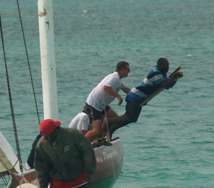 There were other wild moments during the races. The start involves all the boats anchoring right along the starting line. When the gun goes off they all pull up anchor while also raising sail. The motion of pulling up the anchor gives a bit of a jump start to the sail filling with wind and the race is off and running. At the first race on Friday, Thunderbird’s captain chose the spot right next to the starting buoy to anchor as a prime place for the starboard tack beginning leg. Two other boats liked that idea and moved the buoy in order to anchor in this prime position. There was no penalty for this! Then a bit later, one of the boats went around the wrong side of one of the marks, and this too was not contested. Rules seem a bit casual here, and it doesn’t seem to bother anyone.