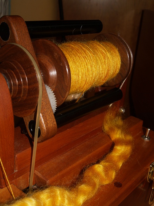 I’ve gotten my spinning wheel out again (properly known as an electric spinner since the wheel is a fly wheel attached to a motor, and there is no treadle!) and am enjoying working with some intensely saffron dyed mohair. It is the color of energy and sunshine and happiness. Zen in my hands!