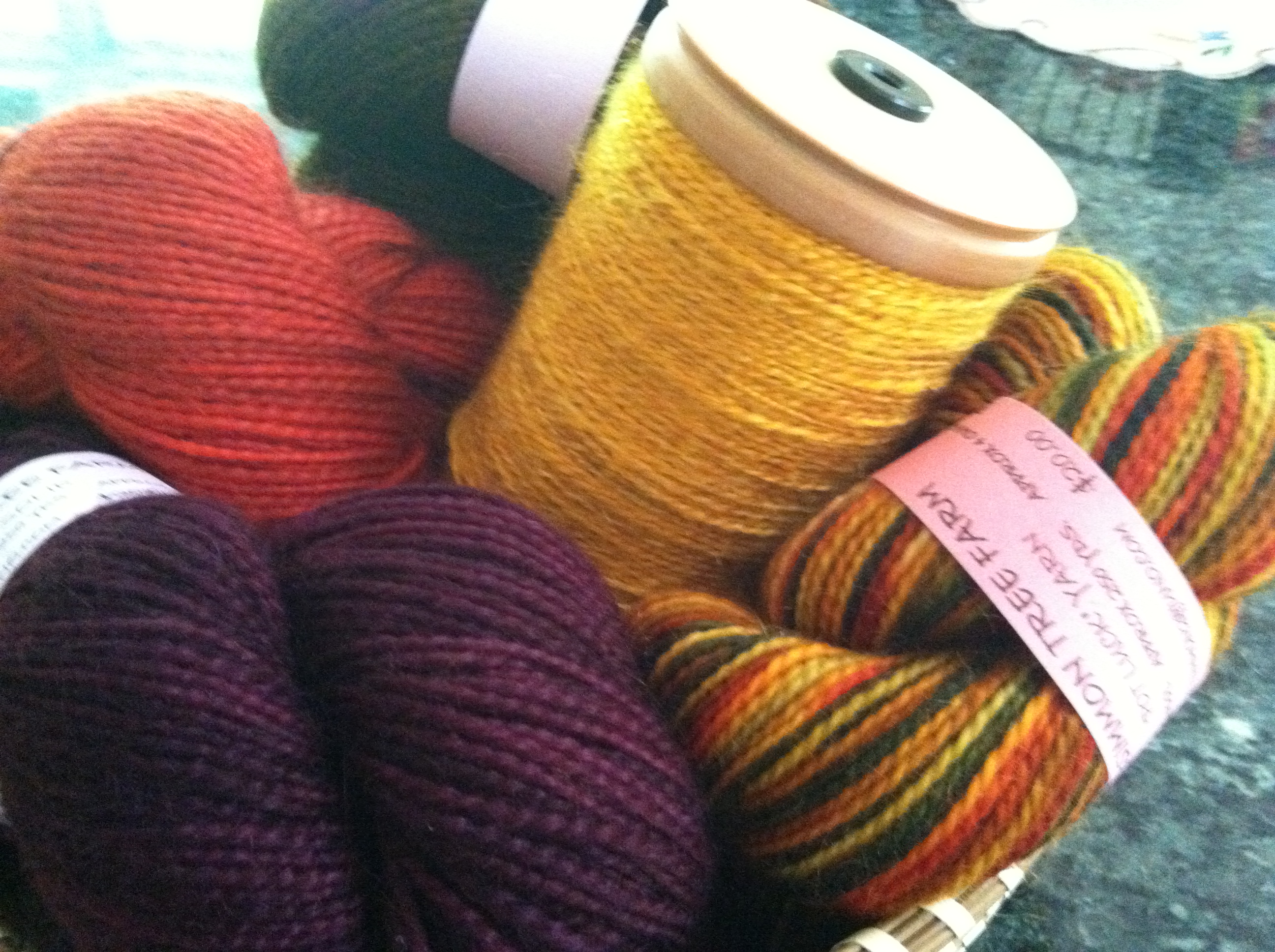 Today I plied the brilliant saffron mohair that I spun in the Bahamas.  Here it is with the mohair skeins from Persimmon Tree that I plan to use with it.  I’m envisioning a fall jacket….