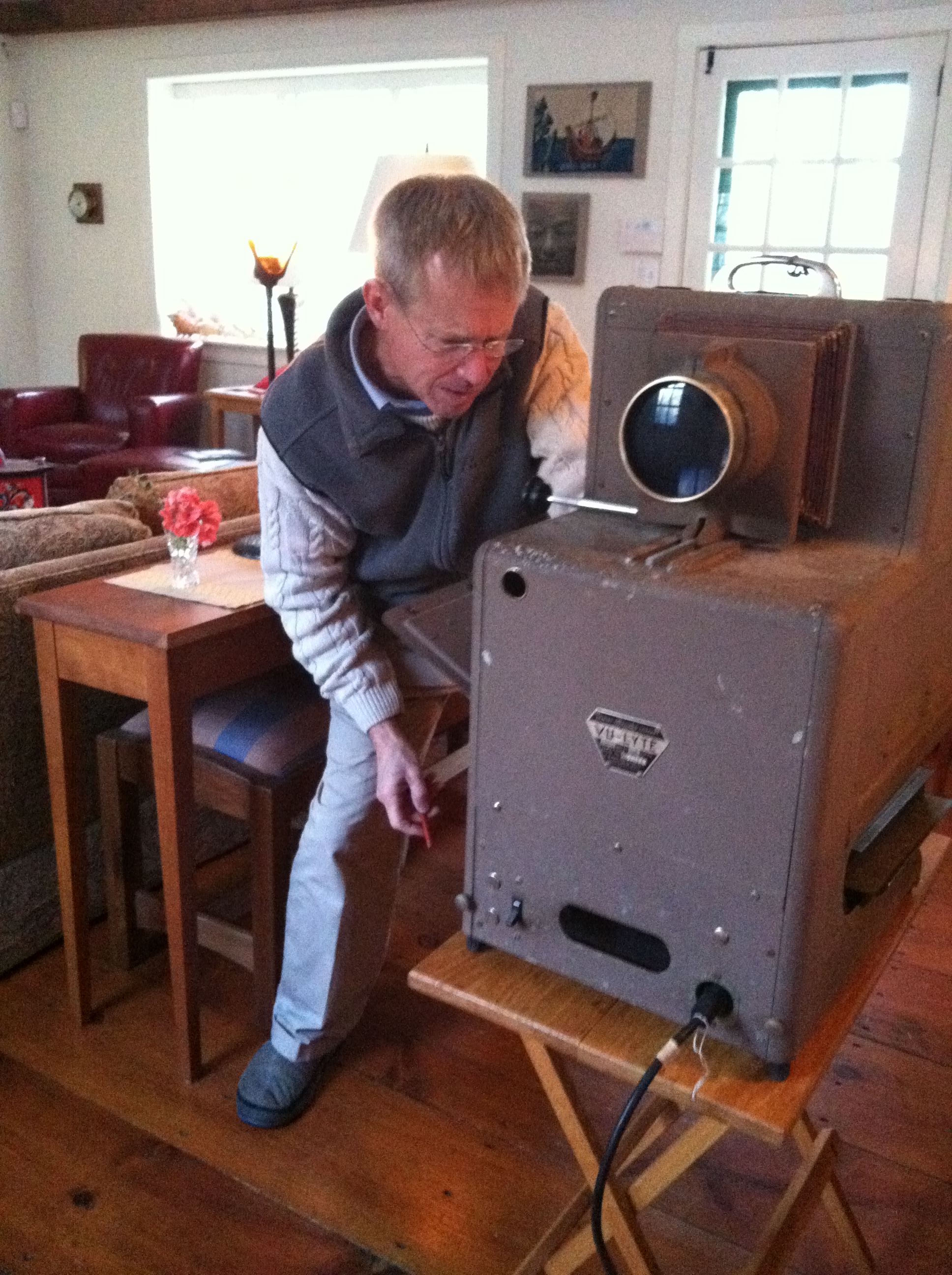 And speaking of making cartoons…. I borrowed an opaque projector from an old friend. It’s quite a relic from the 50s and makes quite a roar when I turned it on. In fact, it blew a fuse, so I haven’t actually gotten to use it yet. Here’s Bob setting it up for me.