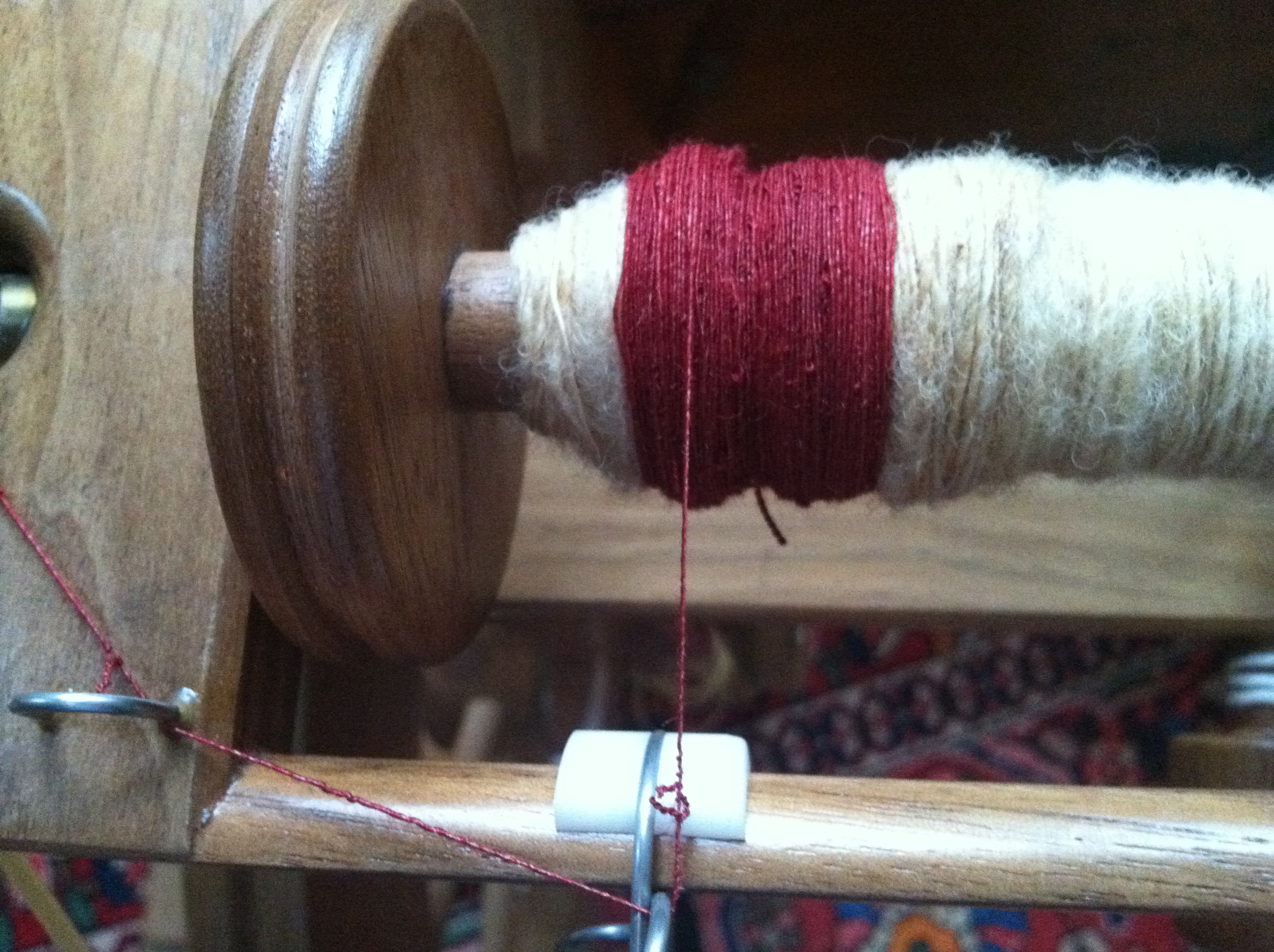 And I’m spinning my first “Tsarina of Tsocks” kit called “Kitri.” The body of the sock is a lovely claret red merino/silk blend. I’m doing a test spin for a 4-ply by topping off a few bobbins with the tsarina fiber so I can ply just a short amount to check my knitting gauge.