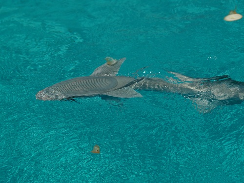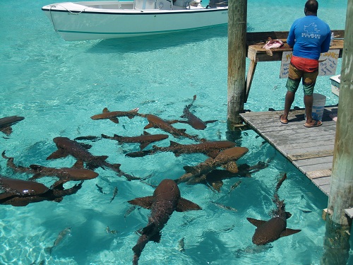 At Compass Cay you can swim with the nurse sharks that they encourage by feeding them each time the fisherman are cleaning fish or beheading lobsters. If bull sharks or lemon sharks come near the dock, someone chases them off. The first day we were there there were almost as many young children in the water as there were sharks. I wish I had a photo of that! Well, in six weeks, I should have a photo of our 30 yr. old son Rob playing in the water with them!