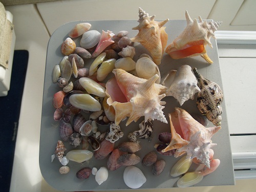 And yet, there are still idyllic spots in between the weather fronts. We did some shelling while hiding from the weather in Pipe Creek, near Compass Cay. Our most exciting find is the tulip snail (right side, center)! They are a predator of little conchs.