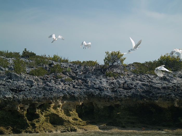 Also at Warderick Wells, we spotted a flock of egrets on one of the small cays, and we startled them into flight with our approach! Back at home we tend to see individual egrets, not entire flocks.