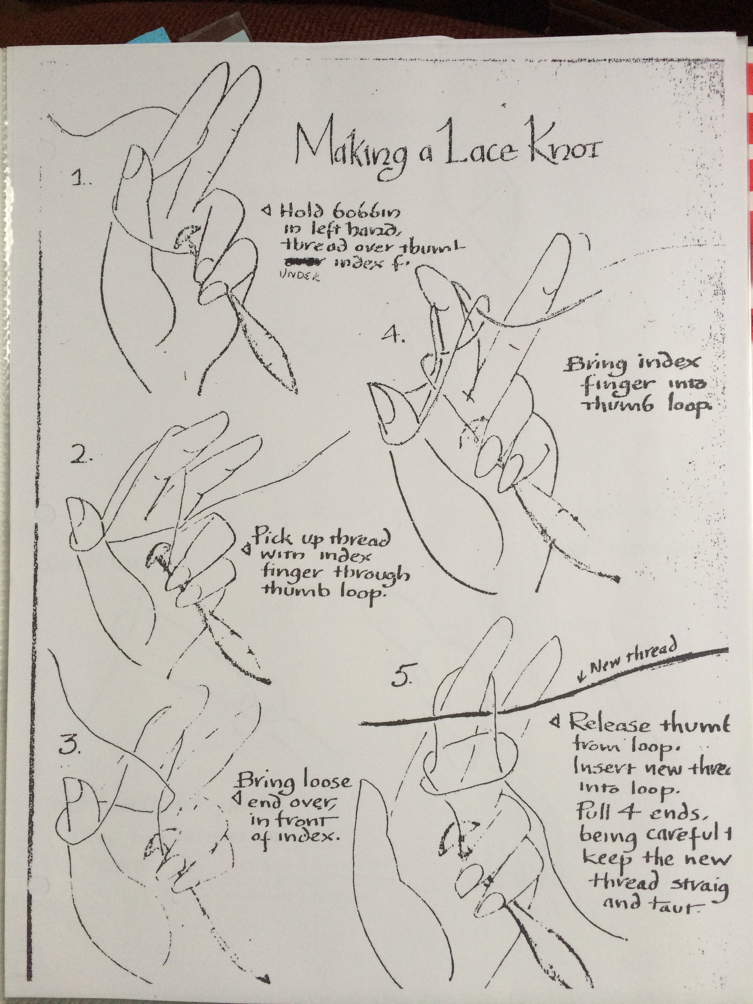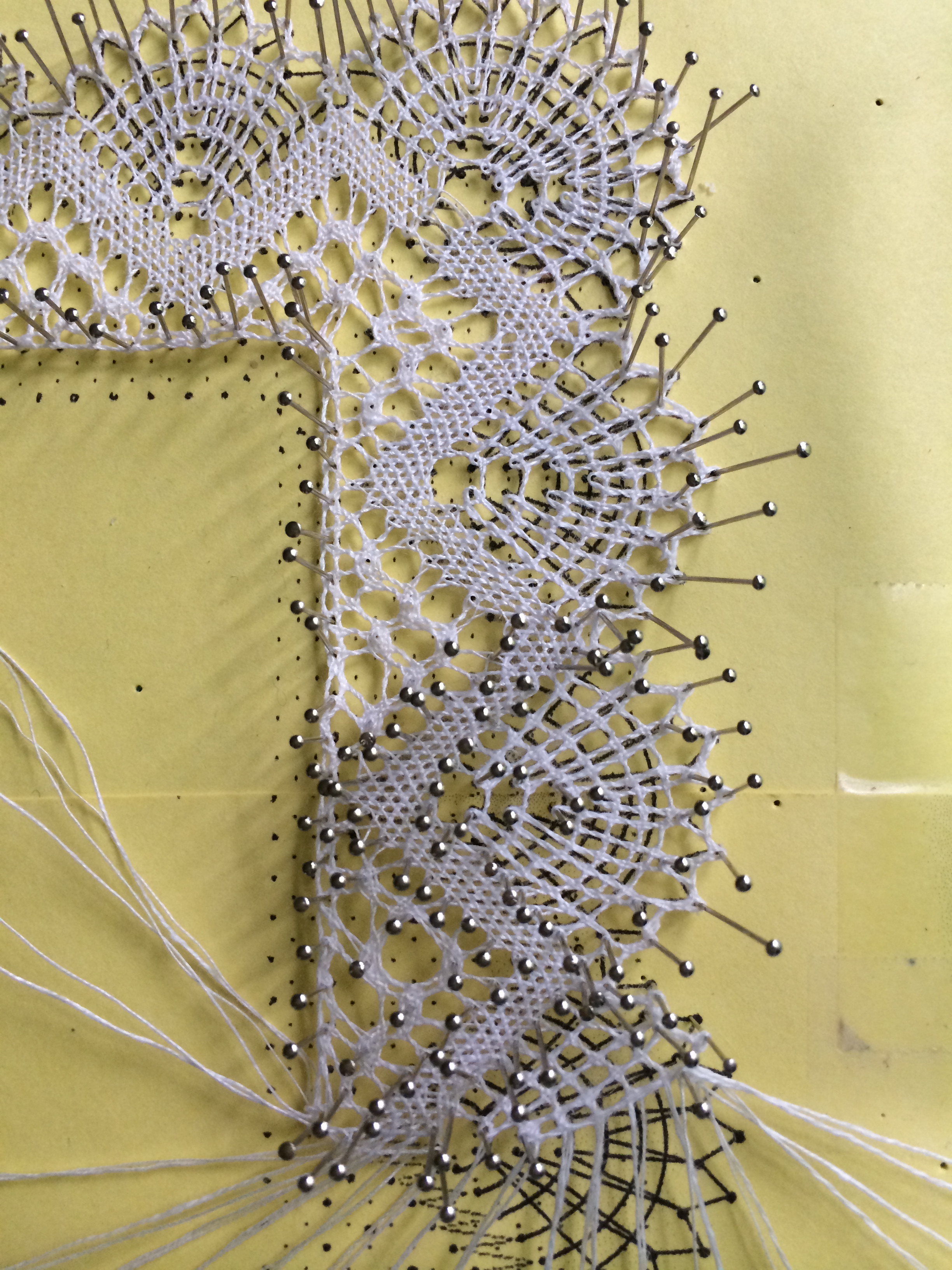I had finally gotten to the point in my current lace project where I believed I had made all the mistakes possible to make. Ha! I had gone backwards and forwards, and backwards again so many times, and had solved problems in all the segments of this pattern: from being short a pair of bobbins in my half trails which then gave me problems in my braided edge, to then ending up with too many pairs of bobbins for my sewing edge. It was an embarrassingly long process which could have been shortened if only I’d had access to some experienced lace maker…..but impatience and stubborness always drove me on!