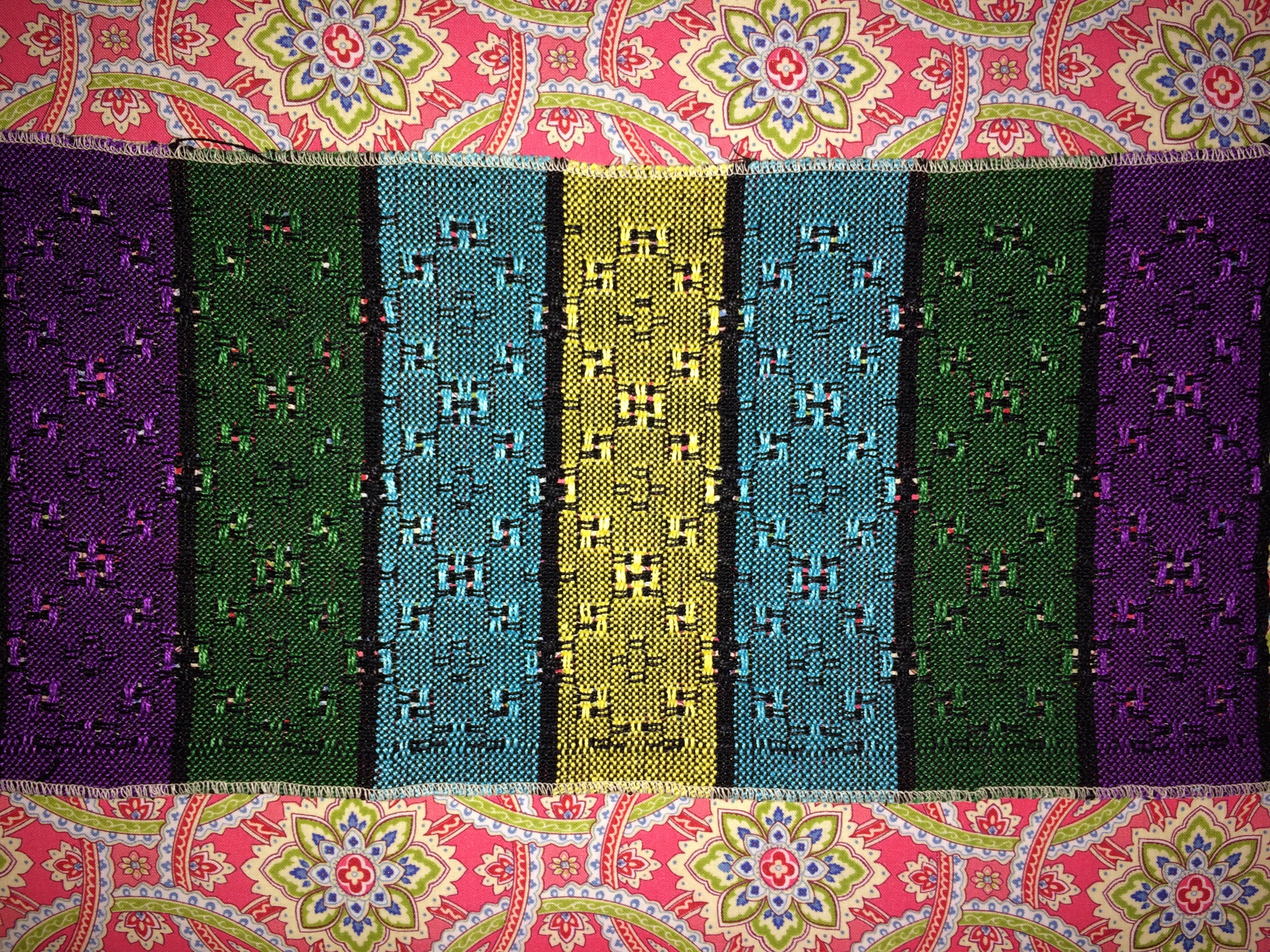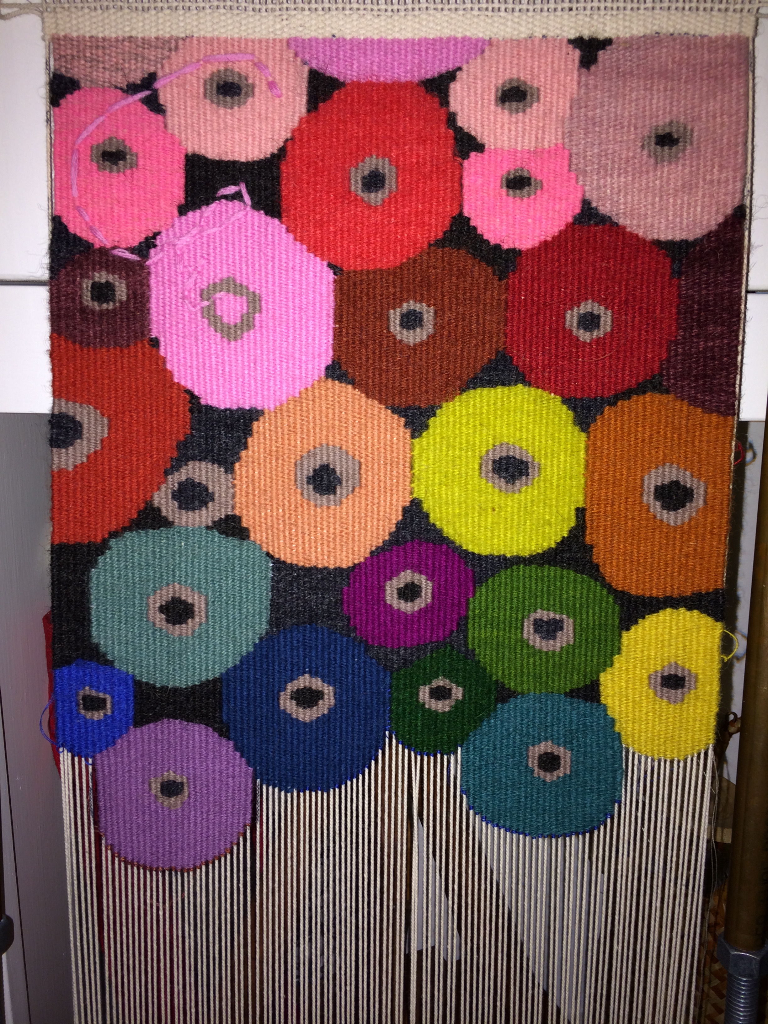I took my spool tapestry, hoping to finish it or at least draw the finishing line across the top. After everyone took a look at it, the general consensus was to have a shaped ending. I really liked that solution, mostly because it meant I only had one more spool to weave! So….it is done!…well, except for all the finishing work.