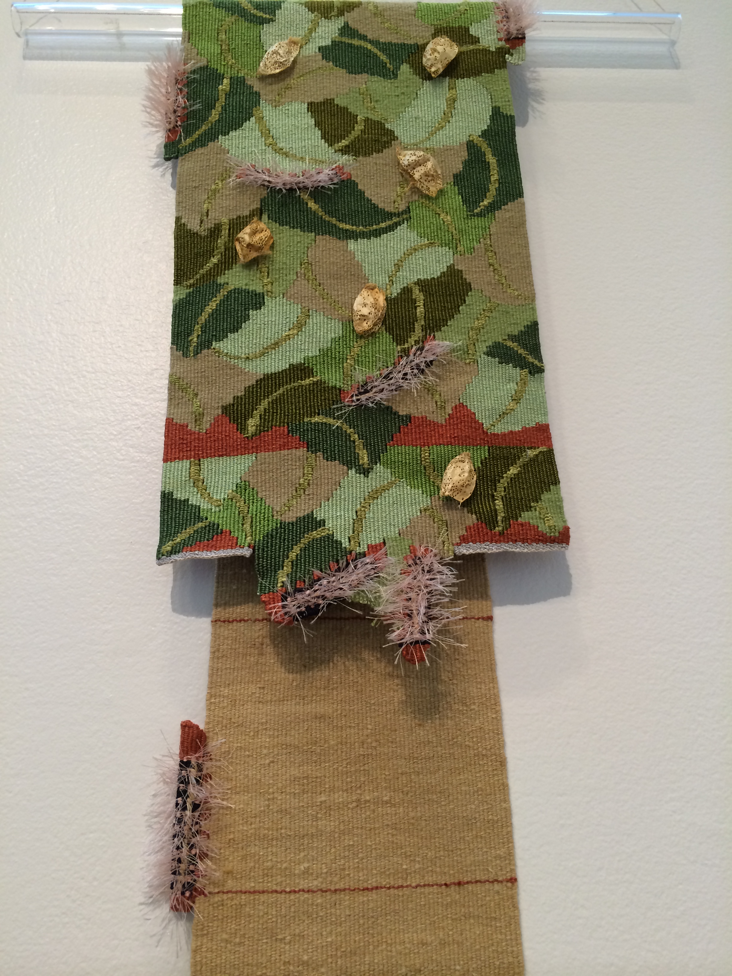 Susan Martin Maffei’s Silk Worm tapestry actually has golden silk cocoons woven into it and is embellished with crocheted caterpillars. …so naturally, the weft is silk.
