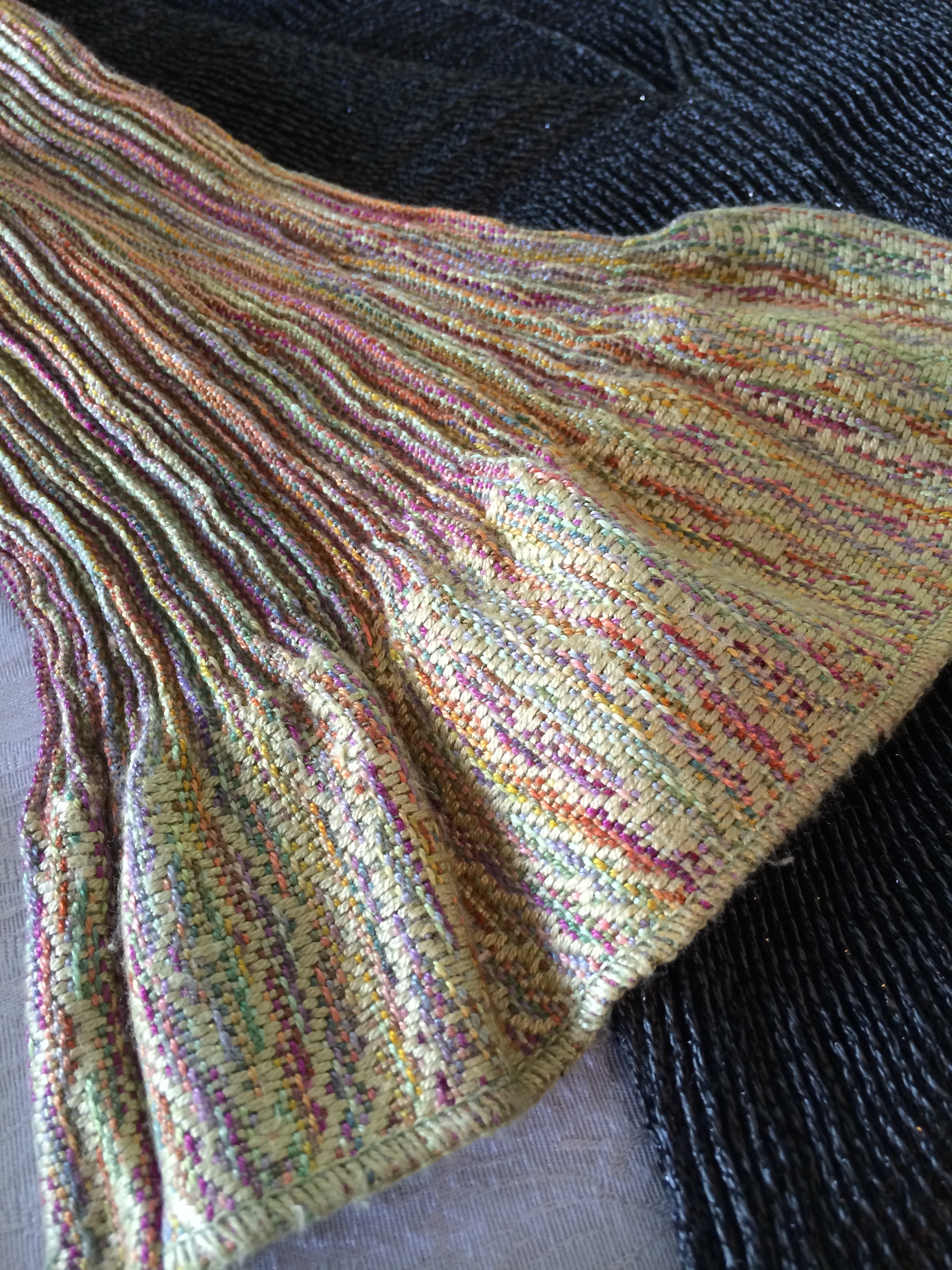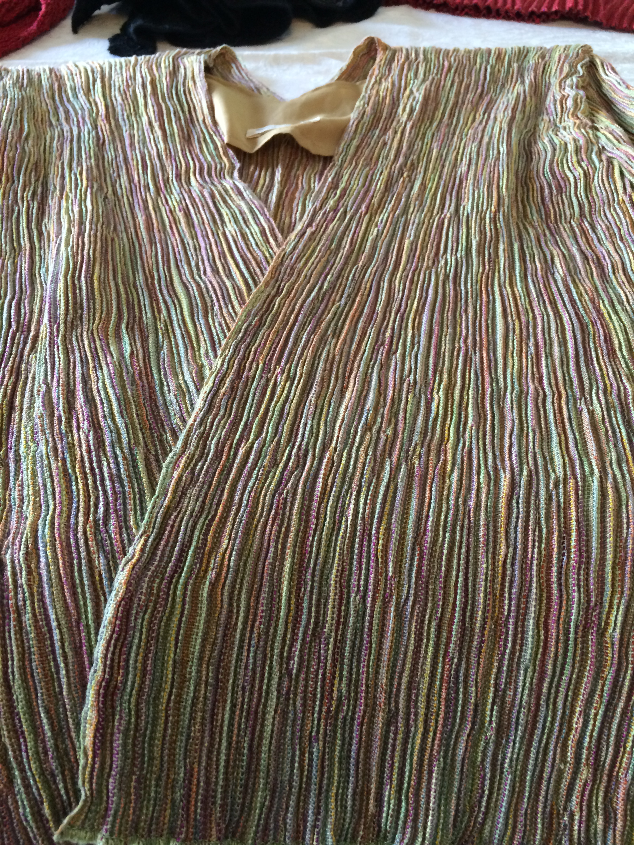 This is one of Dianne’s finished pieces called “Garden Party.” The fabric looks like Fortuny himself pleated it!….and the warp is a luscious blend of three different tencel colorways of Just Our Yarn’s “Almaza.” I have my own stash of “Almaza” which has been ‘aging’ (as veteran stash collector and weaver, Kathi called it!).
