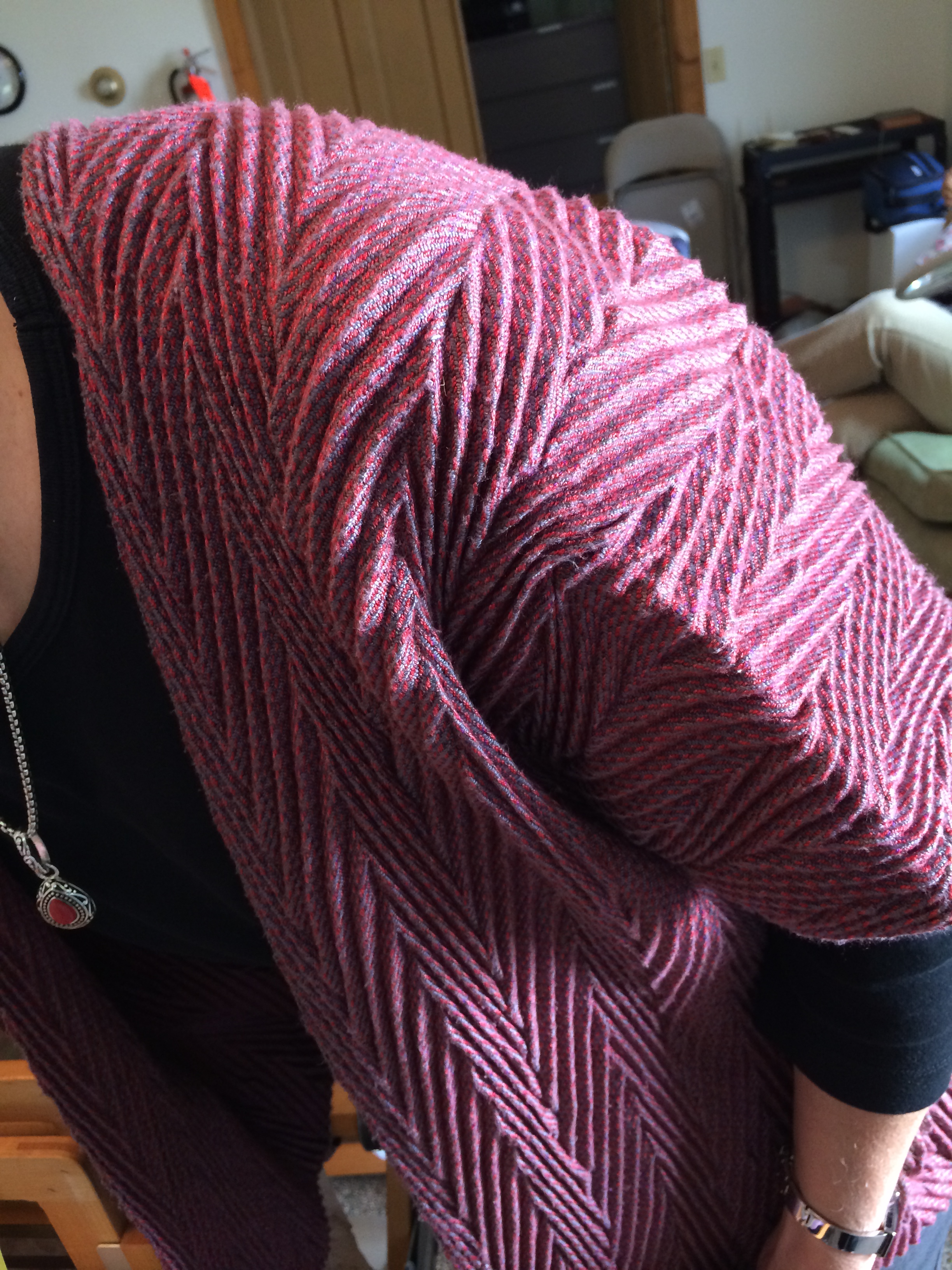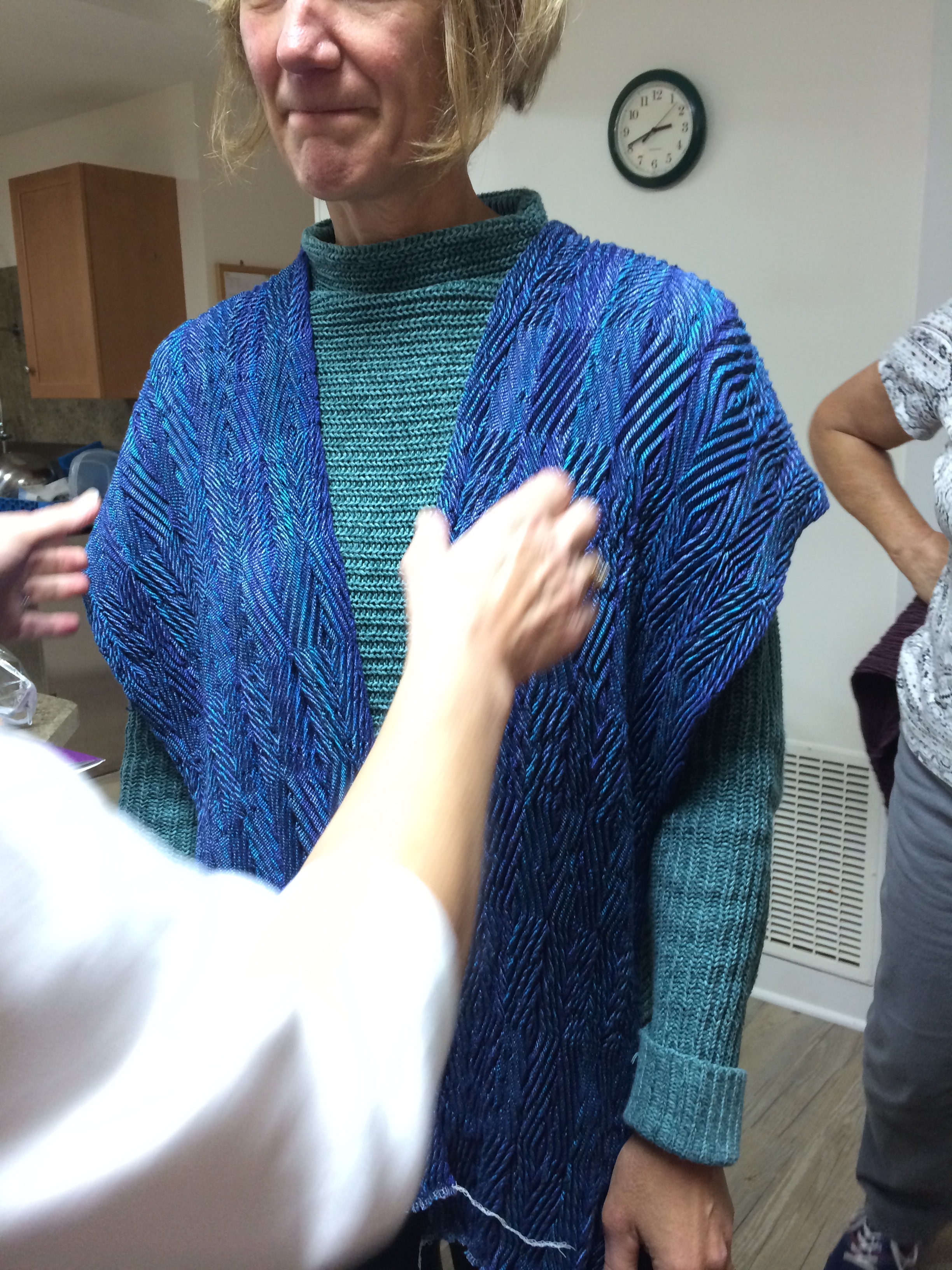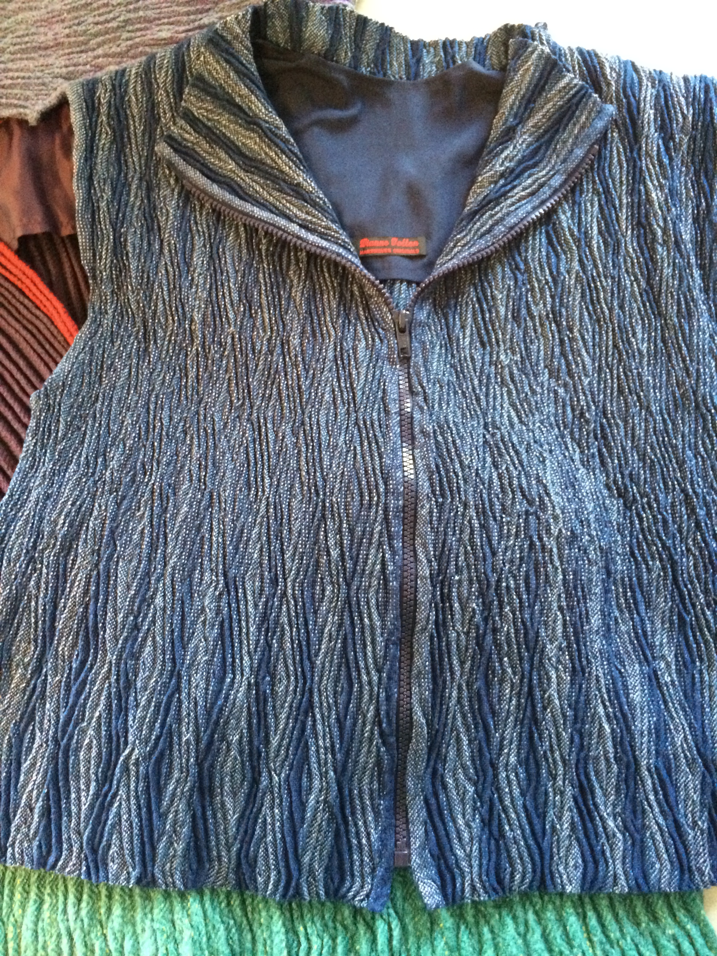 Here is Dianne wearing one of her beautiful vests. This is an advancing twill on 16 shafts, woven in a straight draw.