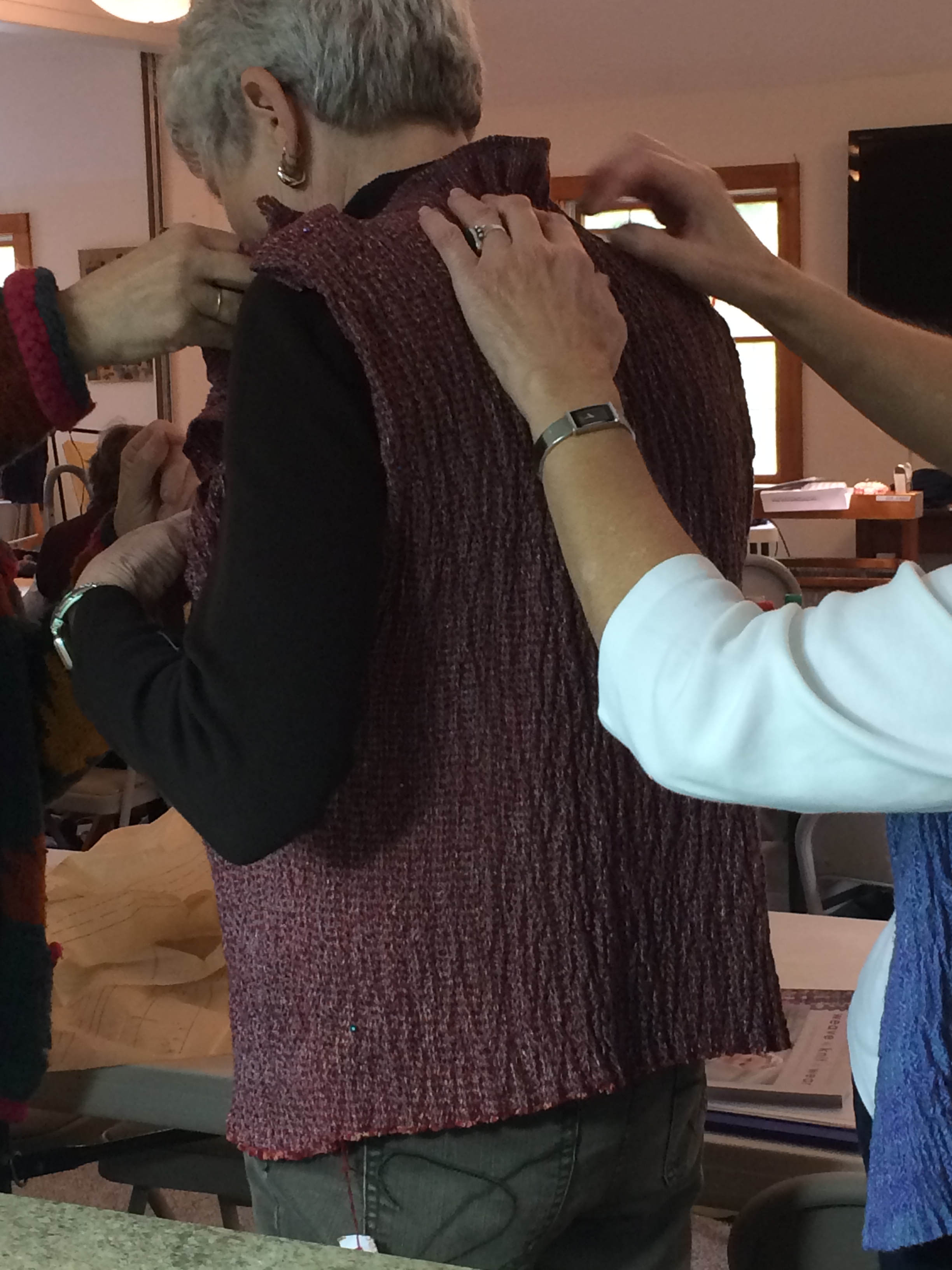 Dianne is an excellent teacher! She is ingenious, creative, and completely open to sharing. She spends plenty of time answering questions and listening to ideas from the students. She’s not afraid to admit what she doesn’t know, and she’s not afraid to problem solve on fitting questions. I think the best part of the class was fitting and constructing the garments for the women who had already woven their yardage. There was so much to consider during that stage, and Dianne gave us all plenty of food for thought!