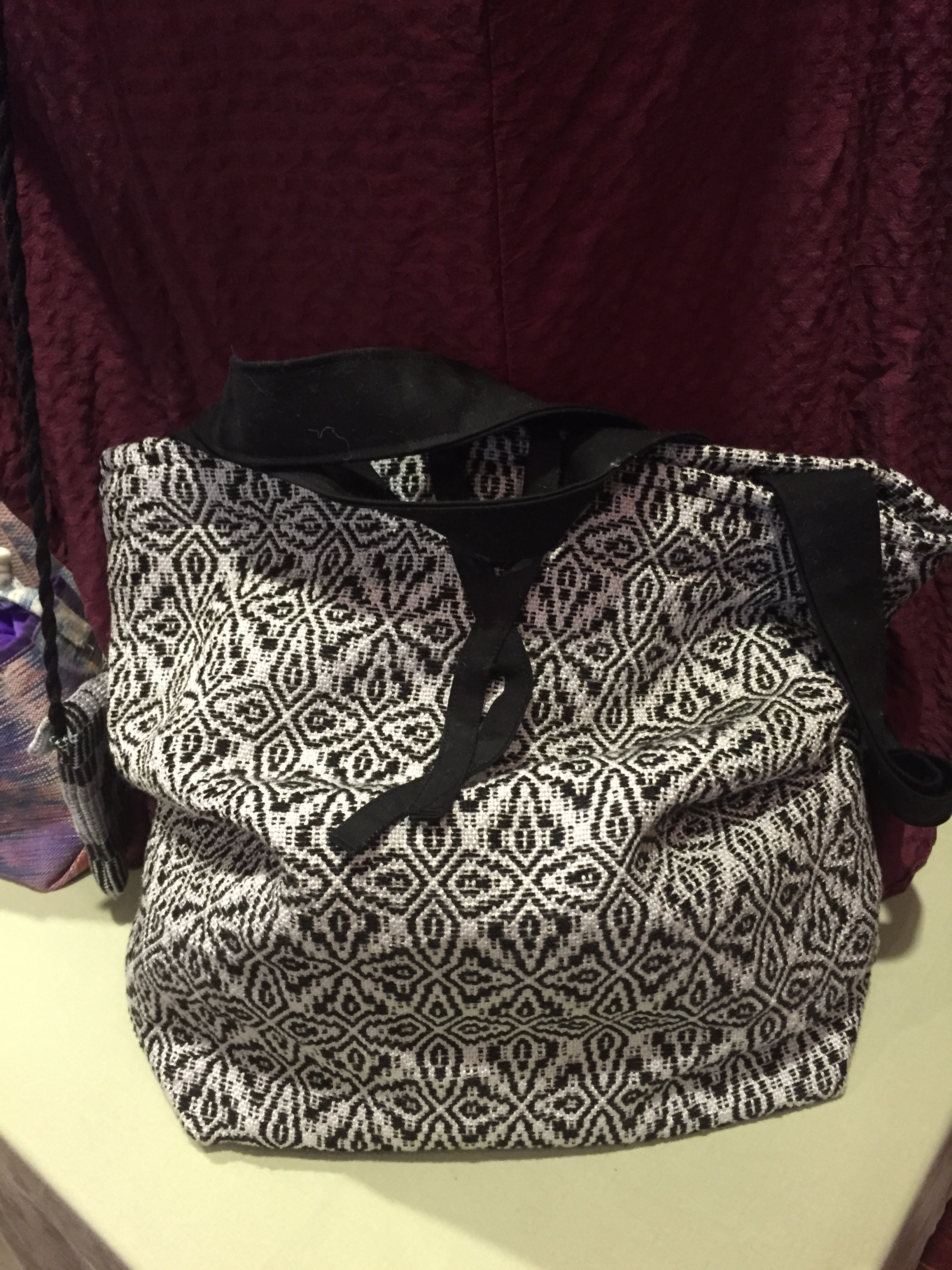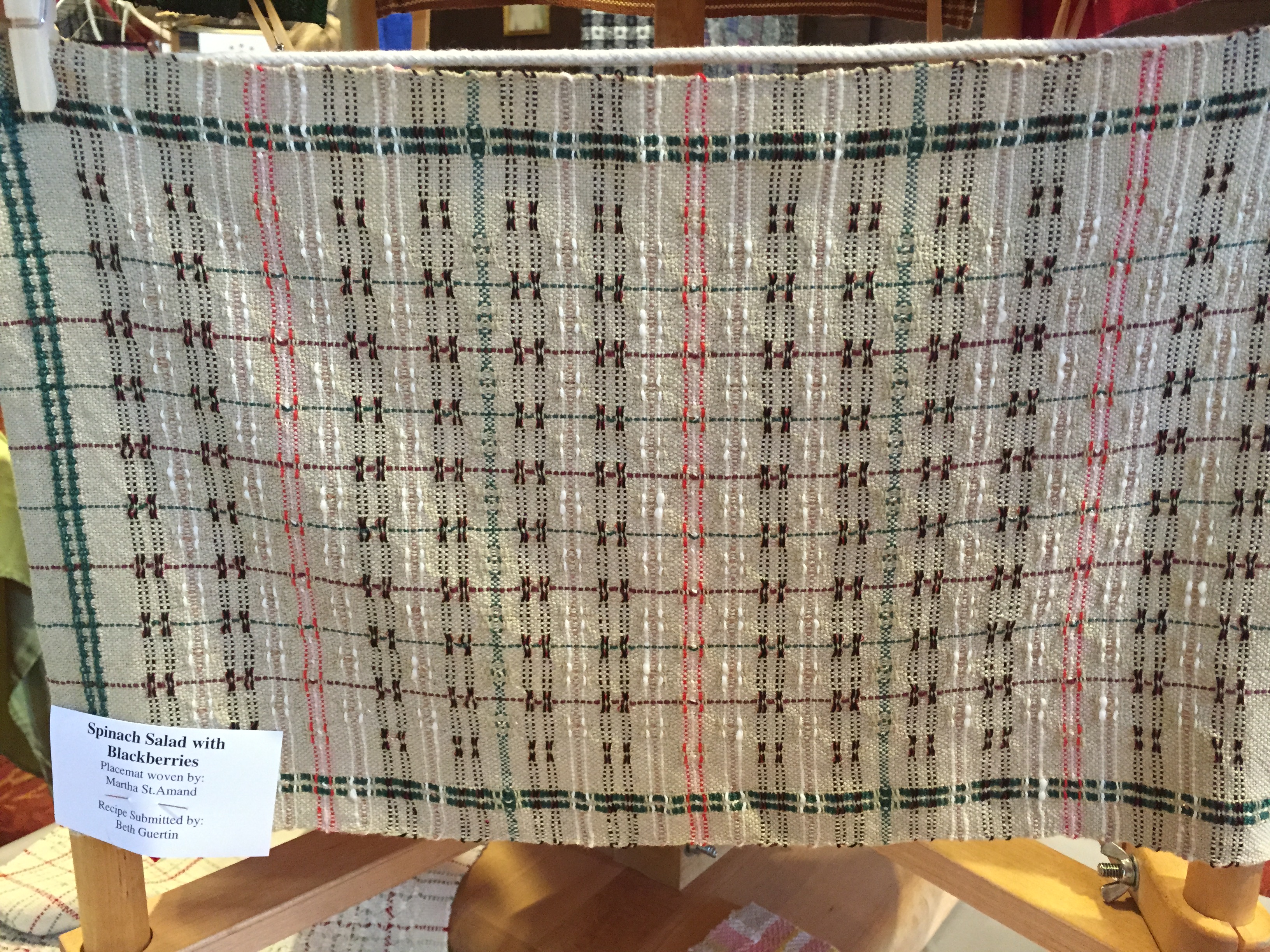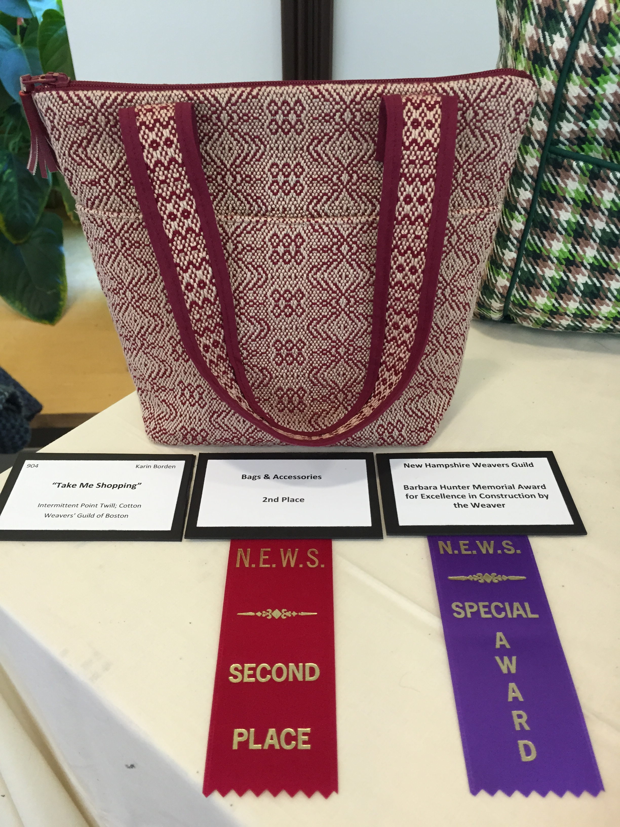 Each guild chooses a theme for their display. This year one guild did textiles inspired by Frank Lloyd Wright, another displayed projects woven by one of their members who has passed away, and another guild woven projects based on personal memories. There was a guild whose inspiration was gardening. I have a photo of a curtain called “Spinach and Blackberry Salad” from that display. Our guild did a display of handbags based on the project that Area 4 did last year of weaving lunch bags and matching napkins to coordinate with a mug that belonged to someone else in the group. It was a grab bag choosing of mugs, and then you designed and wove the lunch bag and napkin to give the member who owned the mug you selected. It was such a wonderful way to weave for someone else, and it honed our design skills along with our weaving skills. My lunch bag was not part of the display since I gave it away last summer, but I have been so intrigued with making bags lately that I submitted my newly finished large tote bag for this display. My photo makes the bags look like a bit of a jumble, and the lighting was harsh. It was actually far more striking than it looks here.