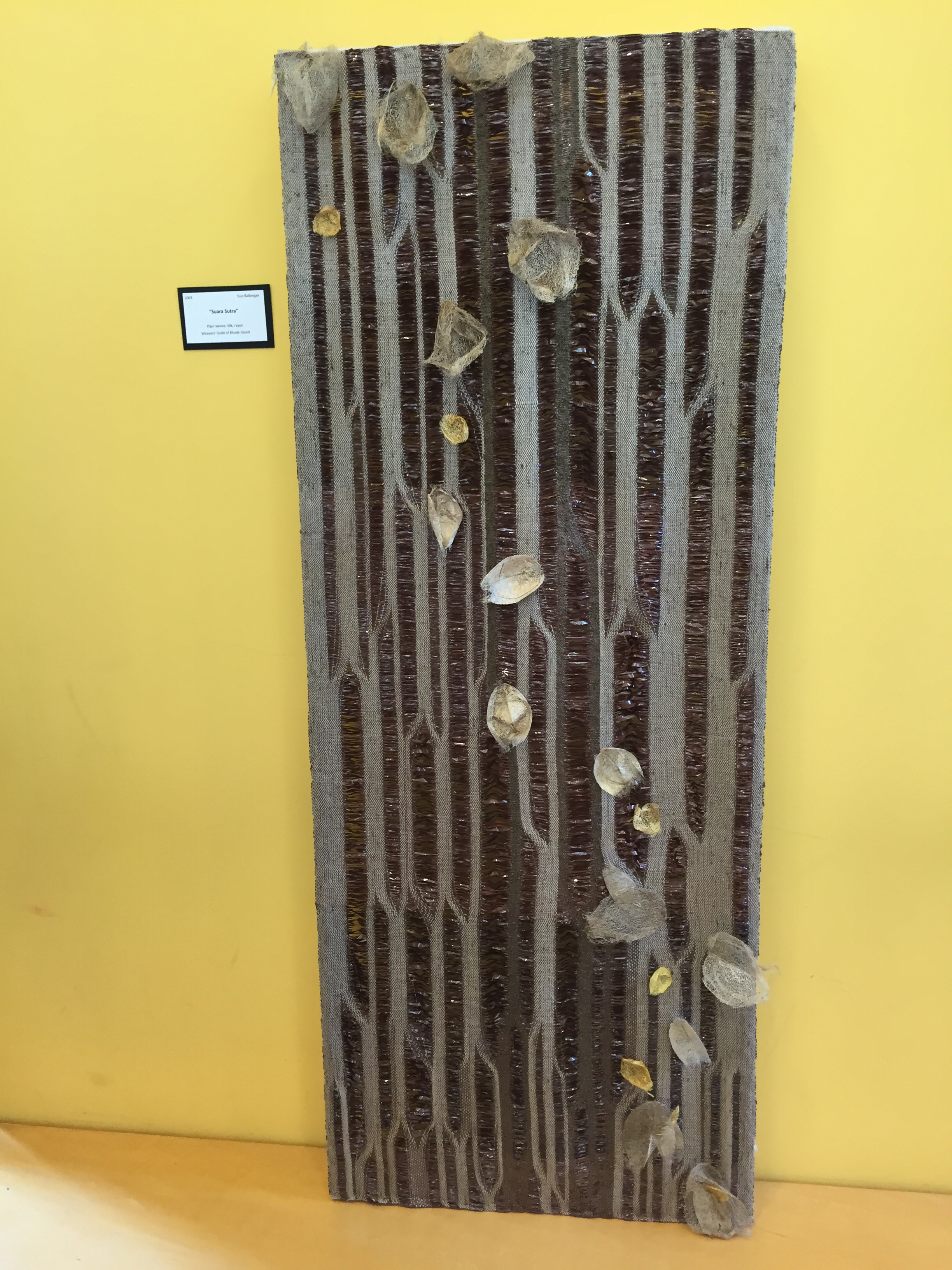 This piece by Suzi Ballenger is stunning! It has silk cocoons attached to it and the weaving was done with her open top beater tool that allows you to move warps, which creates the warp undulations in the fabric.