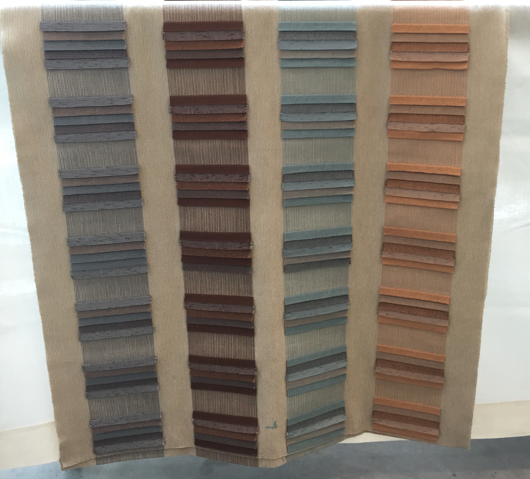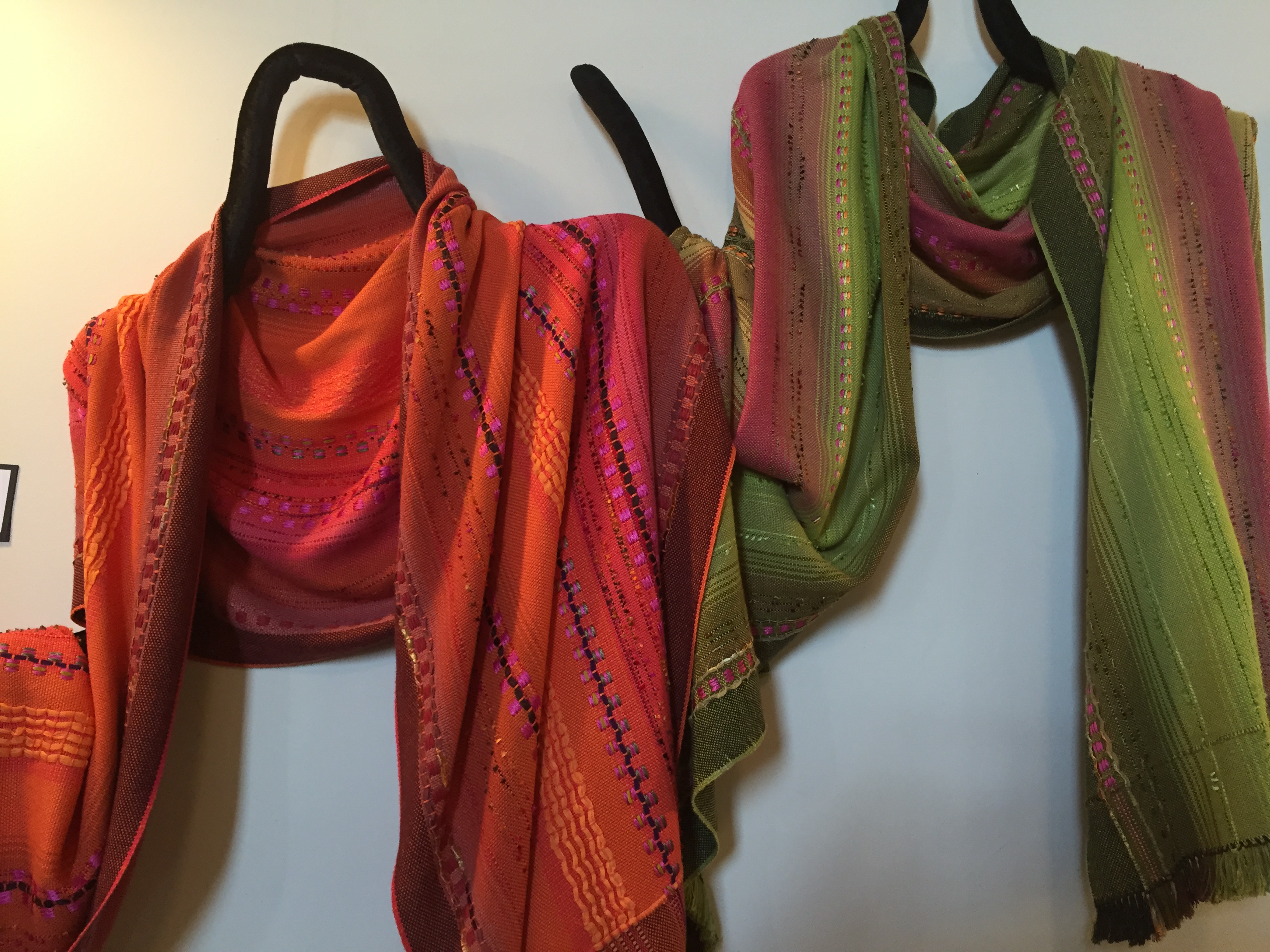 This is Sarah Fortin’s double weave fabric. I have no idea how she gets some areas to pleat and rise off the flat surface of the background fabric. Beautiful colors and beautiful weaving.