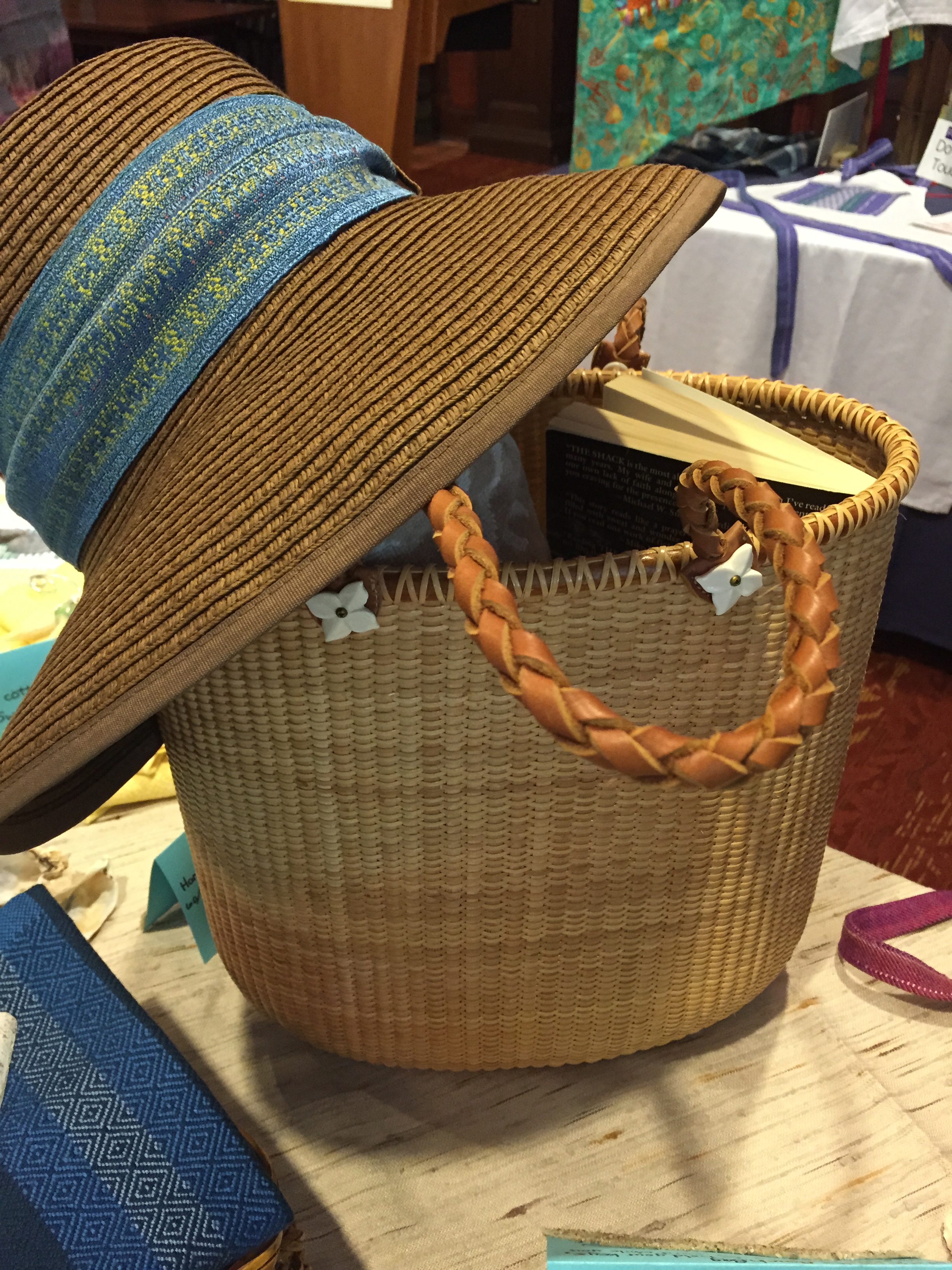 I think the next image may have been from a picnic themed project, although if so, I missed reading the details of what this group’s theme was. Lovely weaving!– a basket tote and a handwoven band for your stawhat.