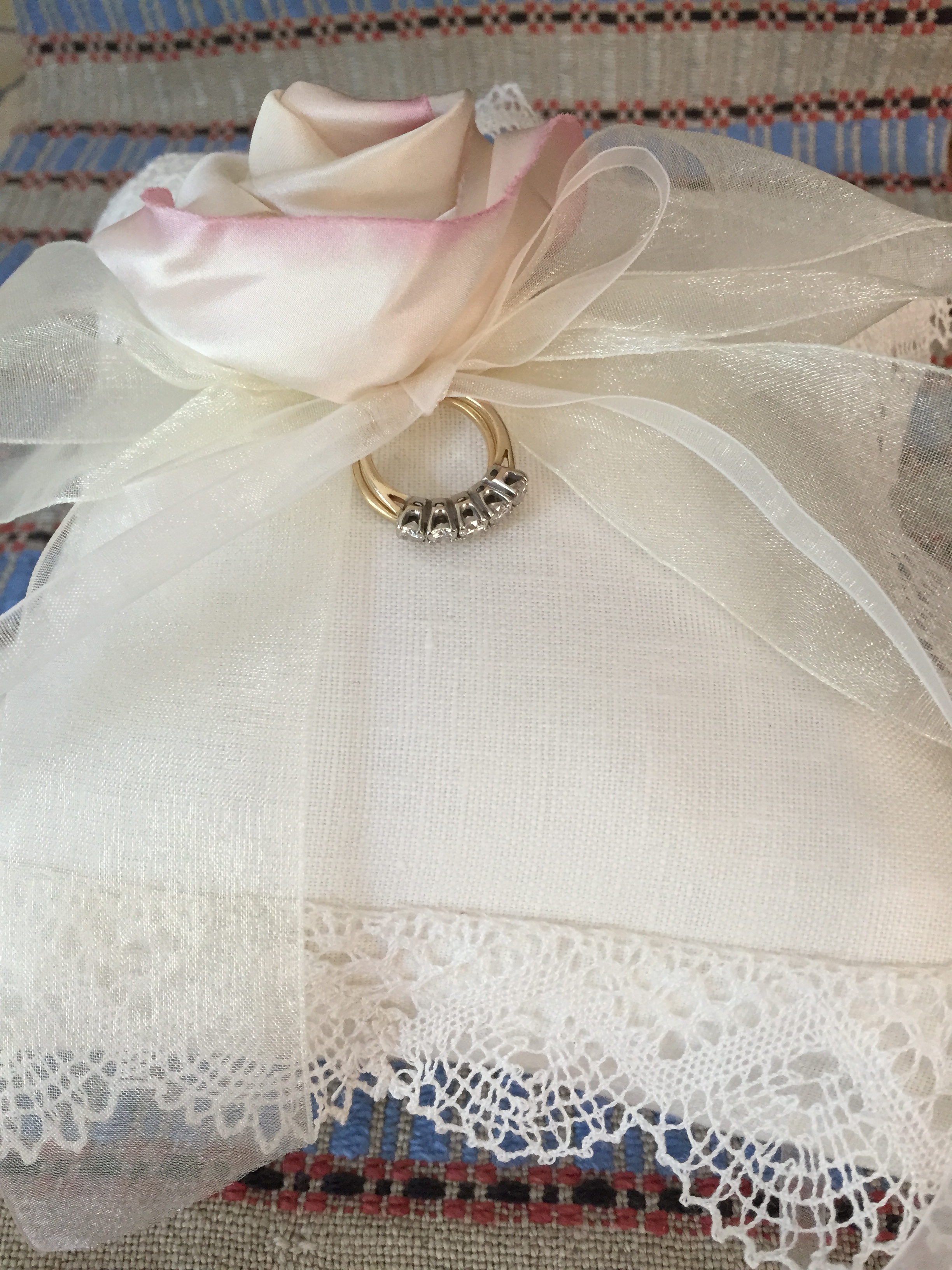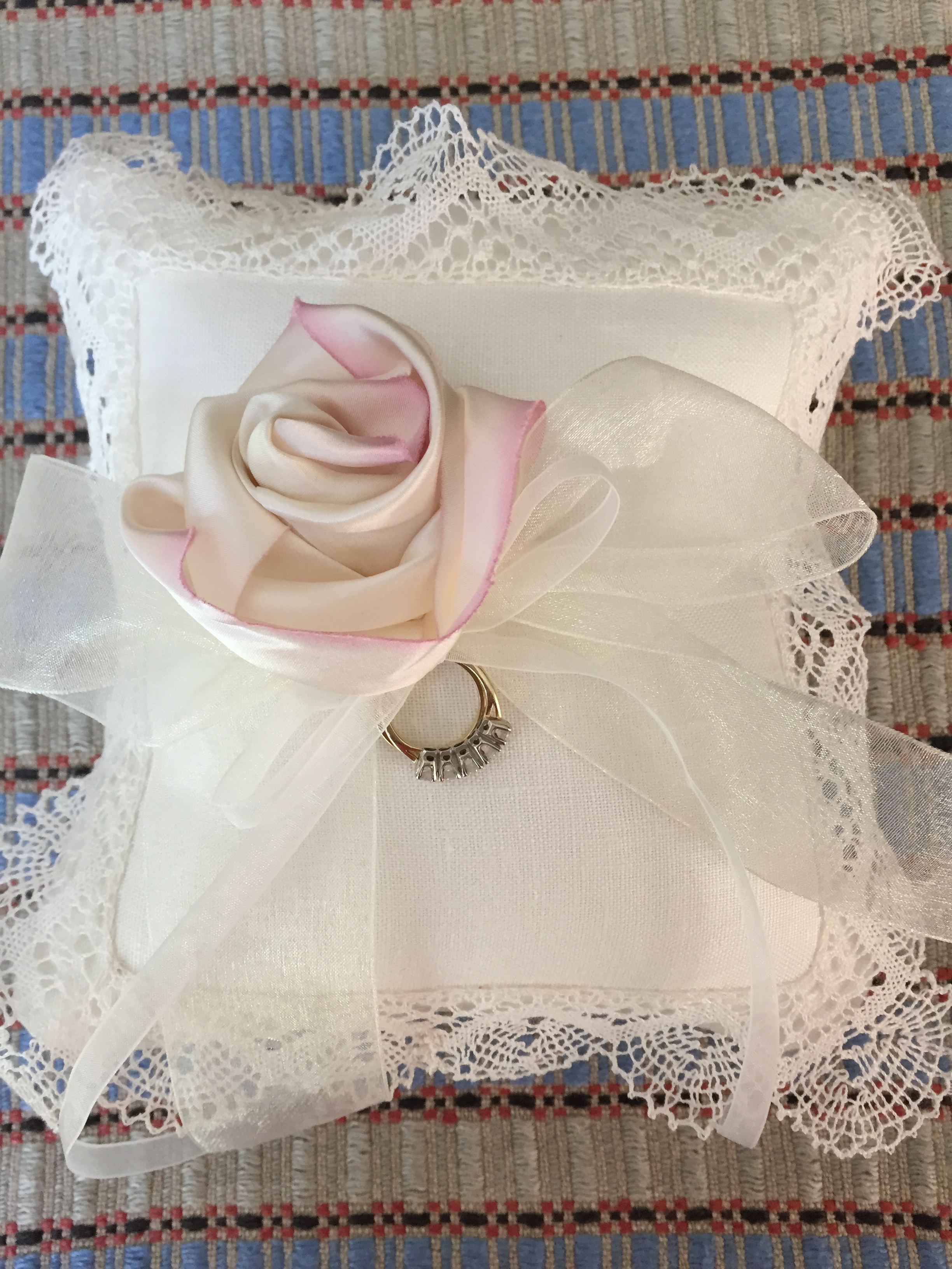 Why am not tackling that warp sooner?– BECAUSE we have our son’s wedding in less than three weeks! I am feeling rather confident about my two wedding projects–the ring pillow is done!