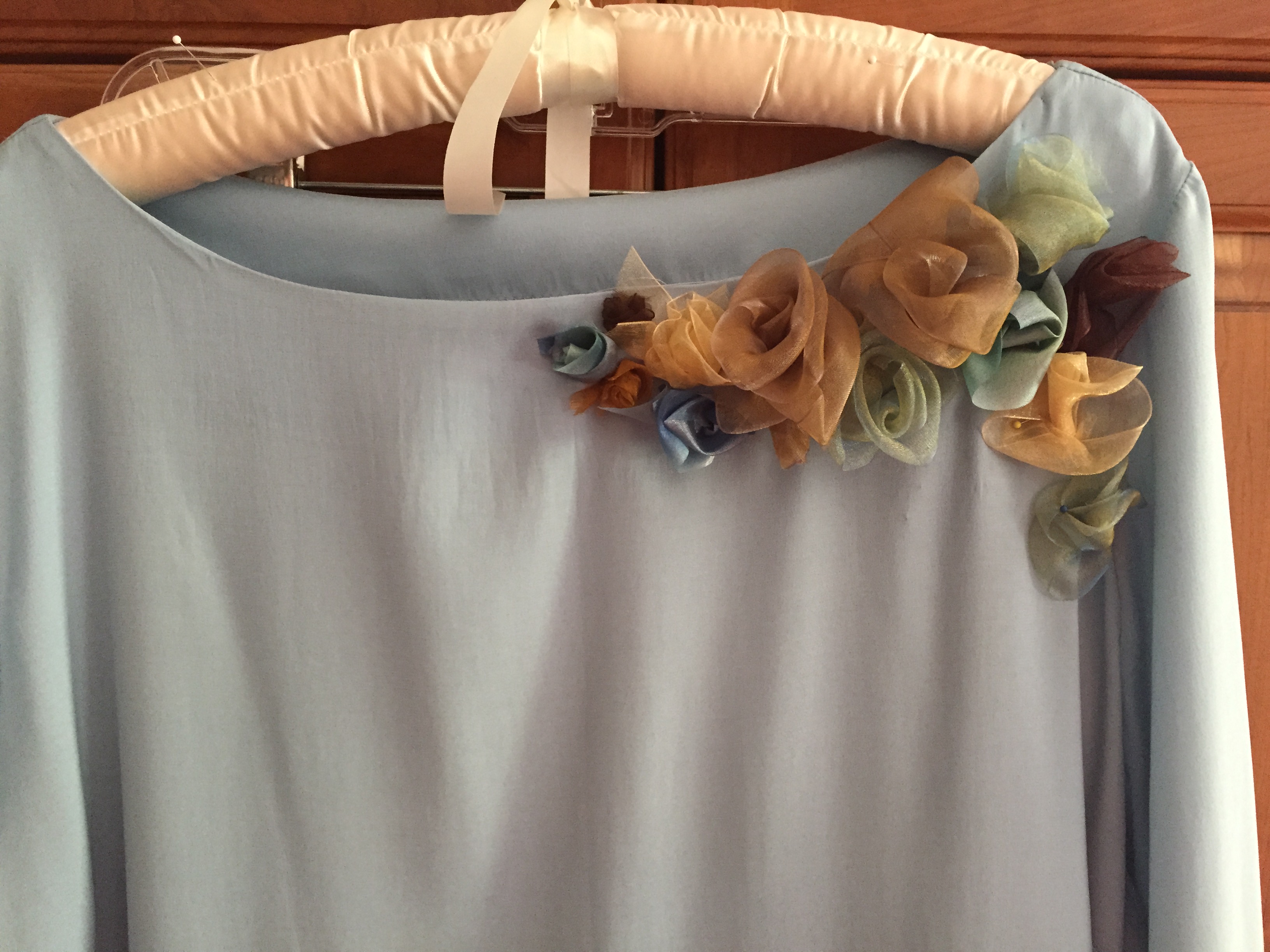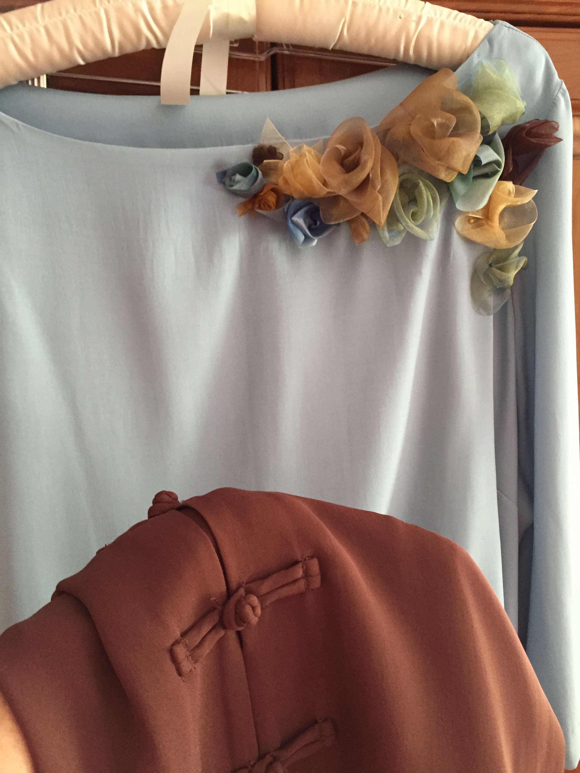 And here is my wedding outfit. The blouse is a vogue pattern for a boatneck tunic sewn by a wonderful seamstress in Amston, CT. I then embellished it with silk ribbon embroidery to coordinate with the brown silk pants.