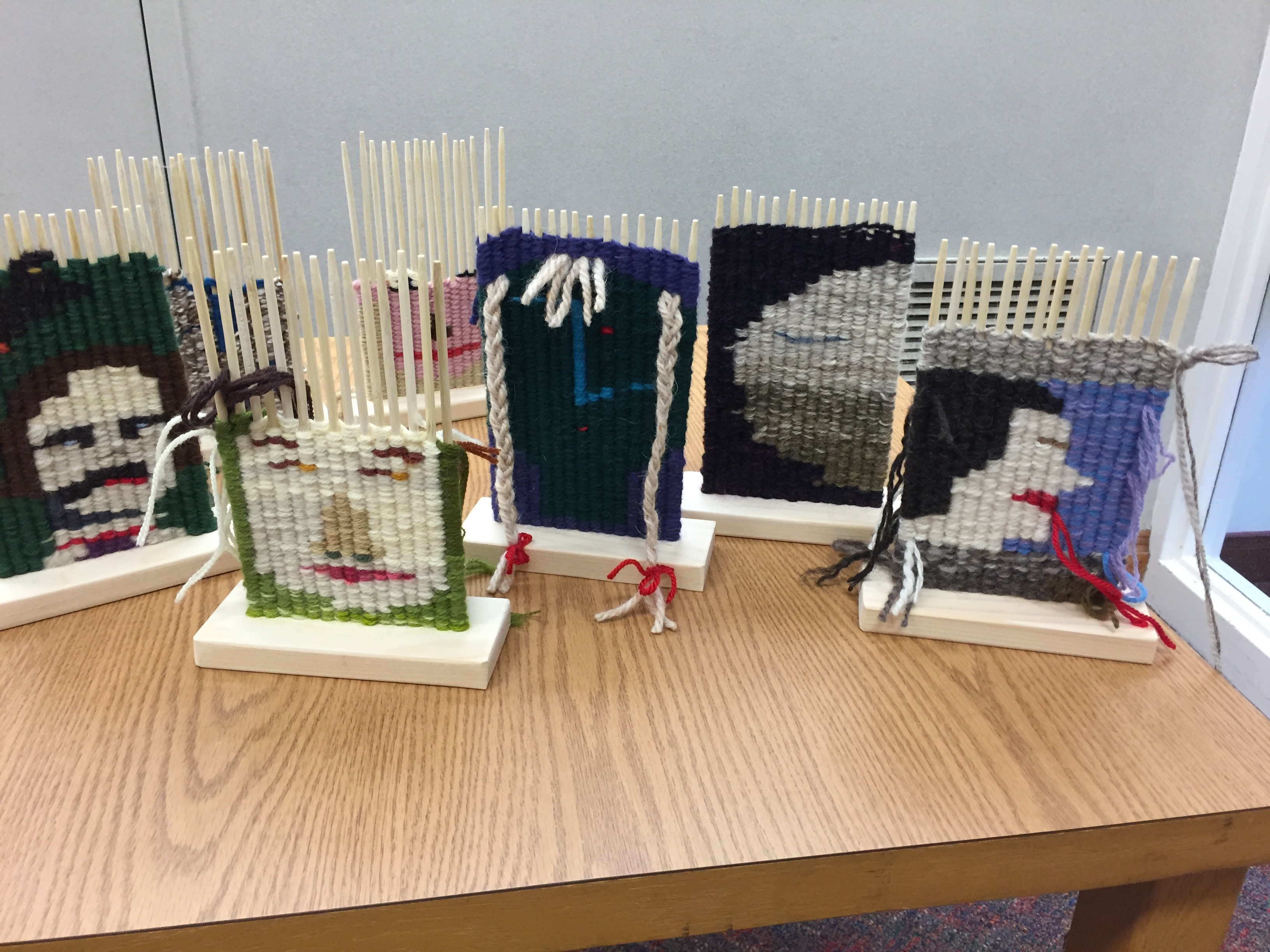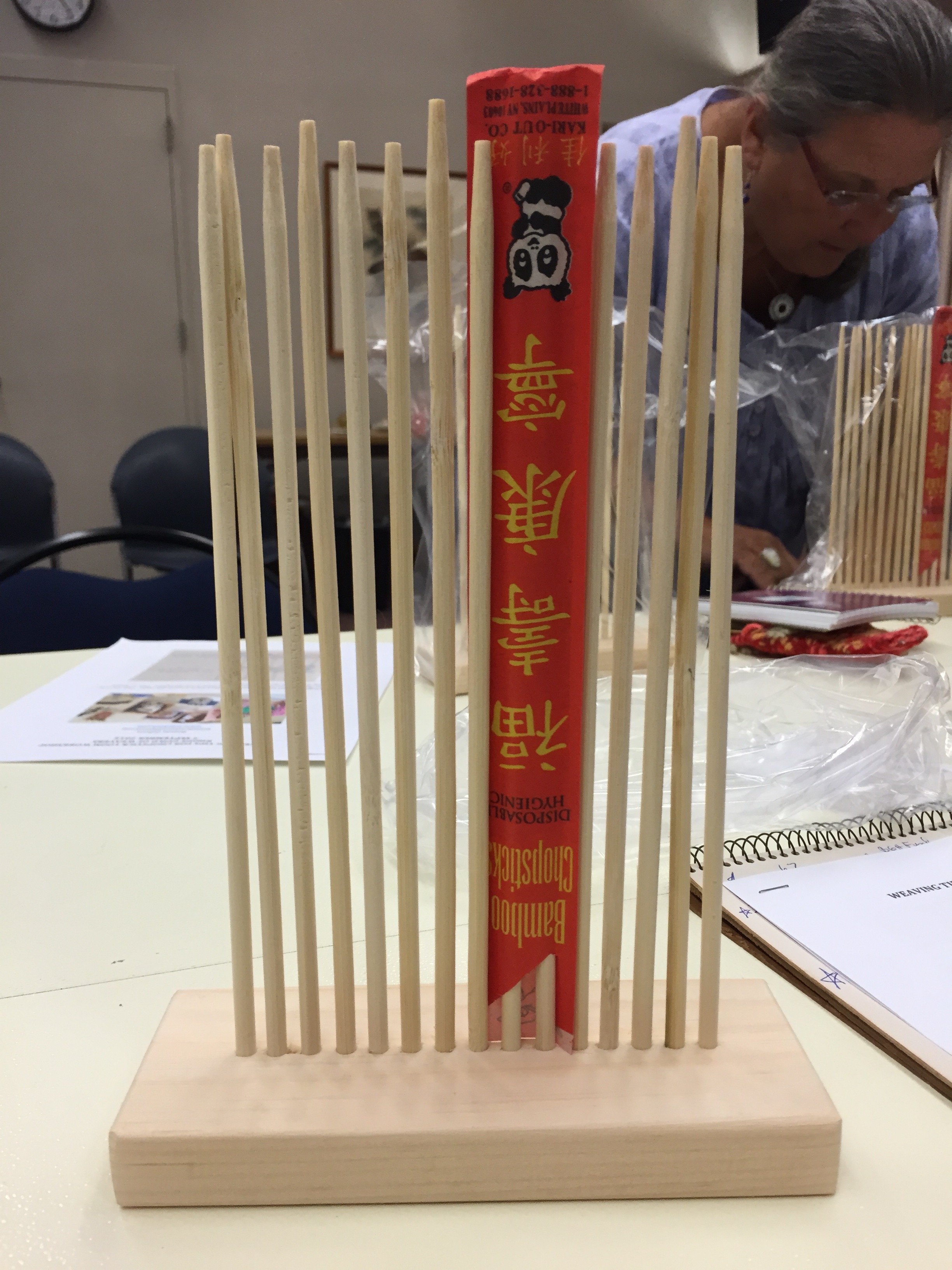 And in the afternoon an adventurous group of guild members tried their hands at weaving on chopstick looms. Sally’s husband made the looms, and he did such a stellar job that it made all our Wednesday Group looms look pathetic! I’m not going to give out Henry’s last name or he might be inundated with requests for these beauties!