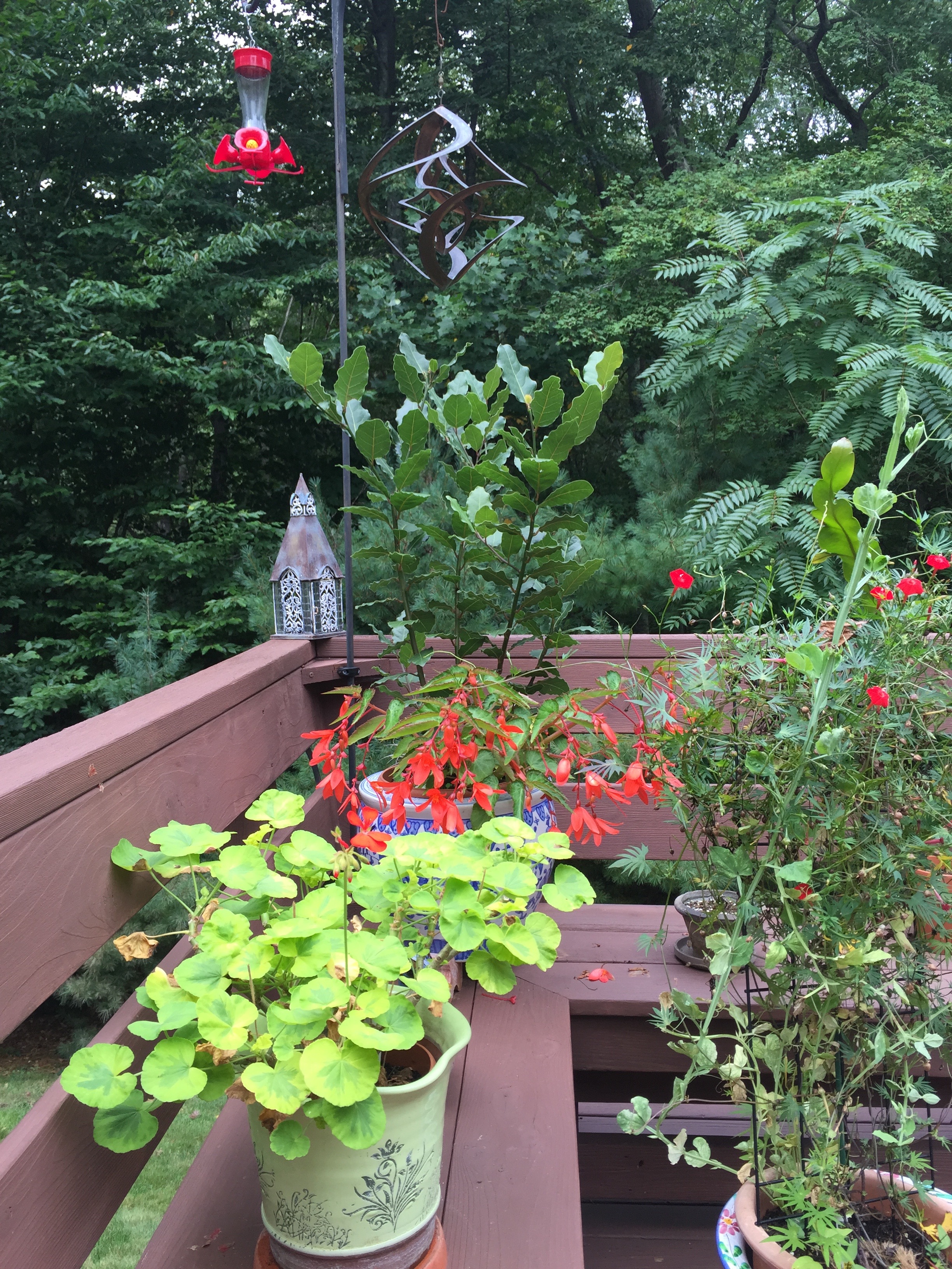 We had more hummingbirds than we’ve had in previous years. One of the females would sit on top of the iron plant hanger and chase away all other birds who came to feed. I grow lots of red flowers on the deck to keep everyone happy. The hummingbirds were constant companions for us.