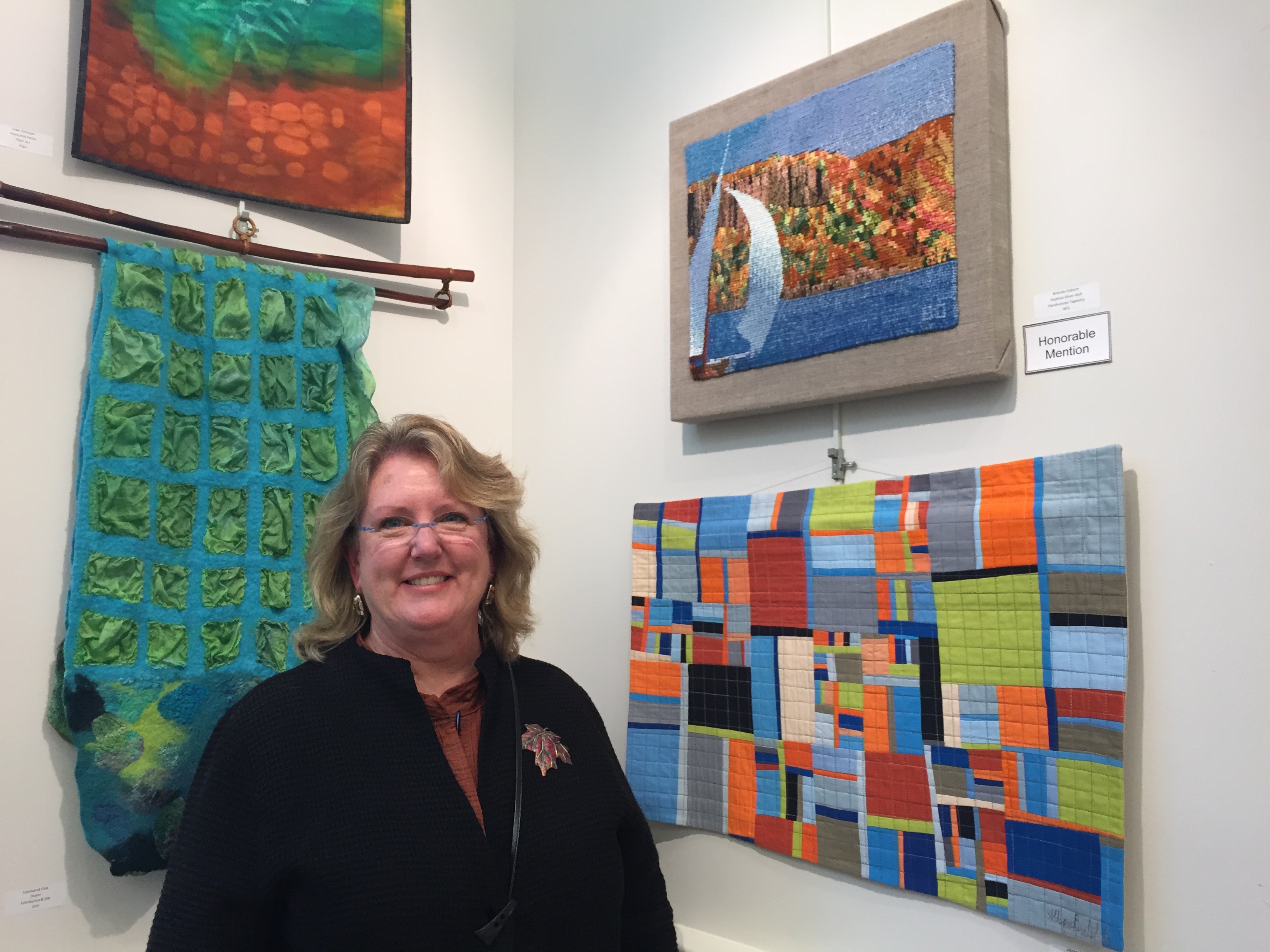 Bob took two photos of my works at the opening. “Hudson River Idyll” got an honorable mention. It was hung quite high above a quilted piece , and our two pieces are quite jarring together. I’m trying to put a happy face on it!